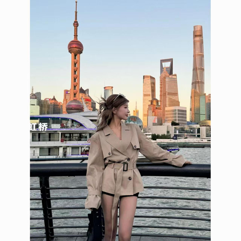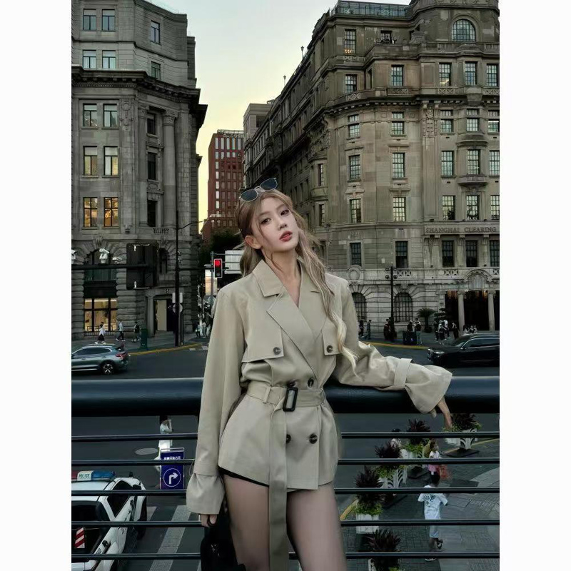 YF6262-图片色英伦风长袖翻领双排扣系腰带卡其色短款休闲风衣外套