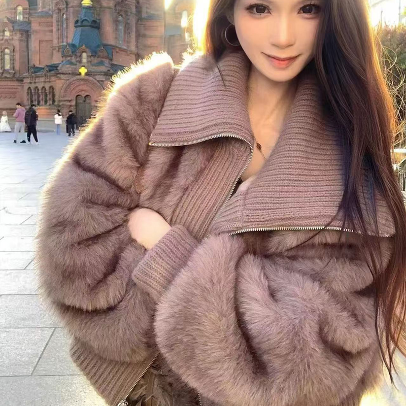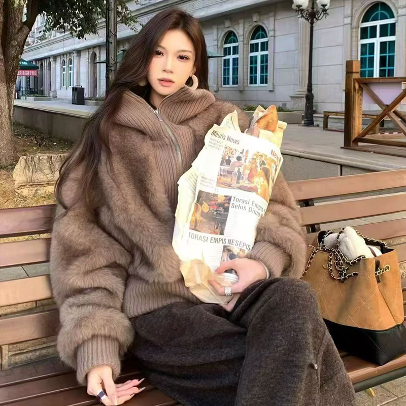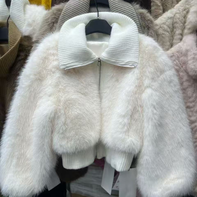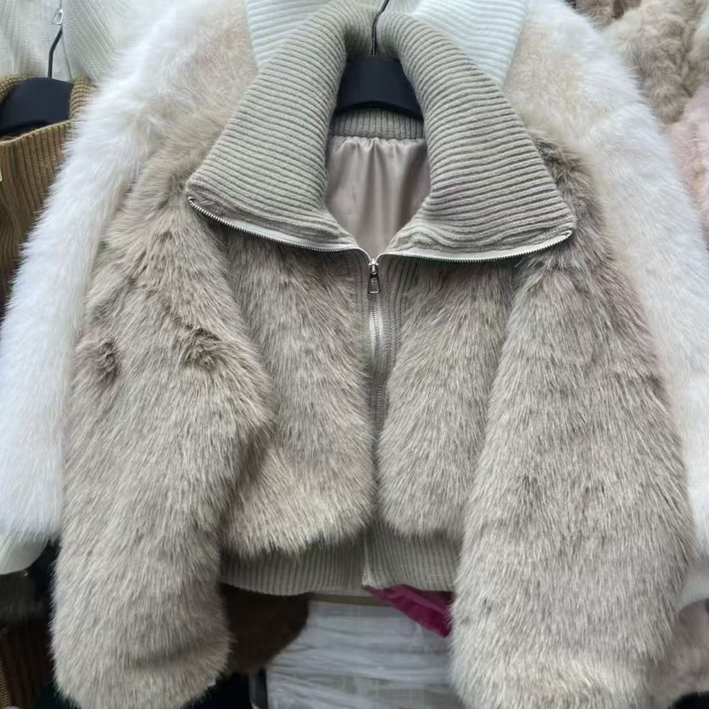 YF6263-(2色入内)冬季名媛气质仿水貂绒毛毛立领拉链拼接针织短款外套