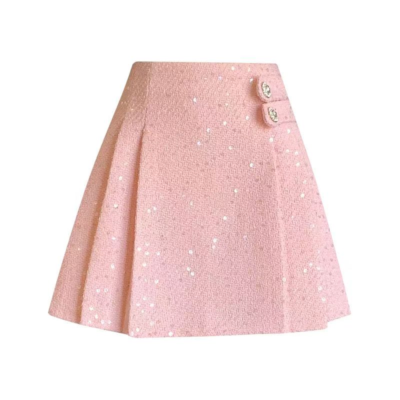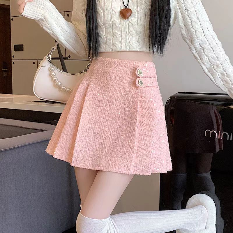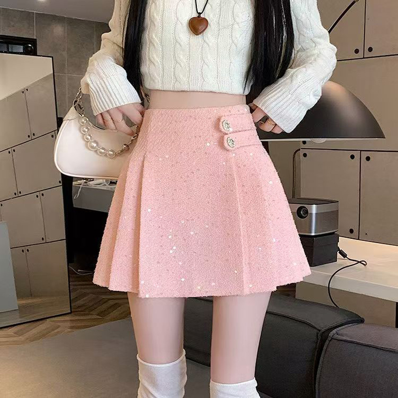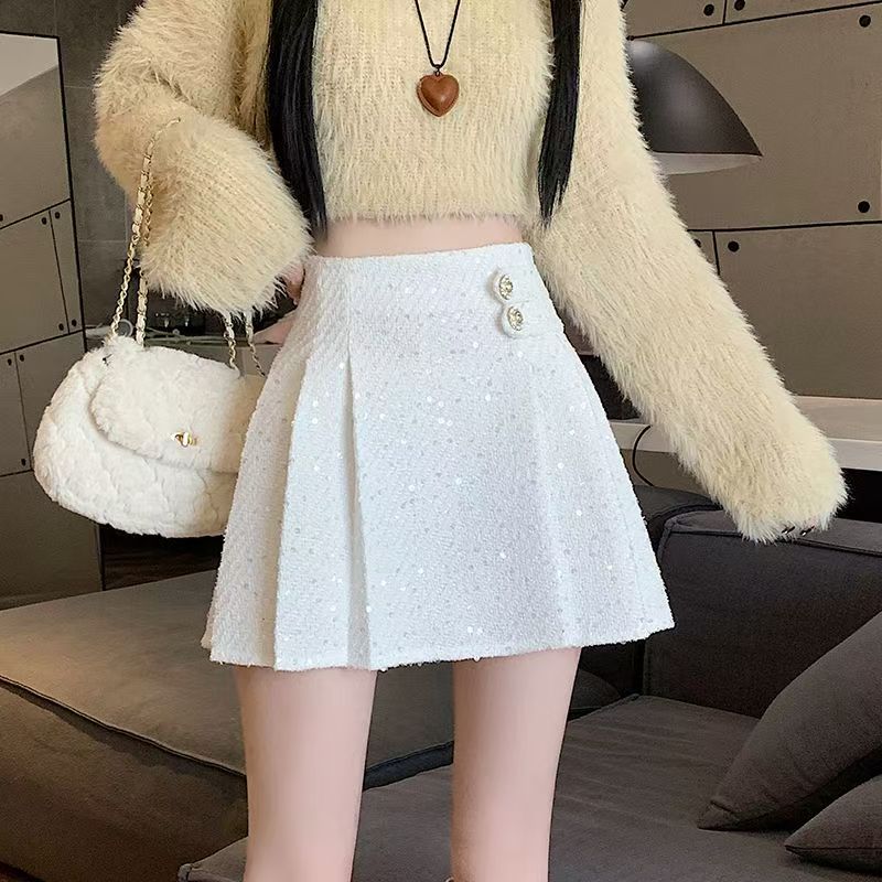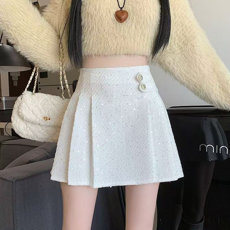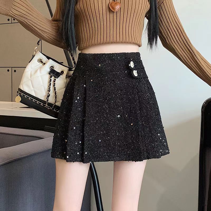 YF6265-(3色入内)秋冬时尚亮片设计收腹高腰褶折A字小香风毛呢防走光短裙