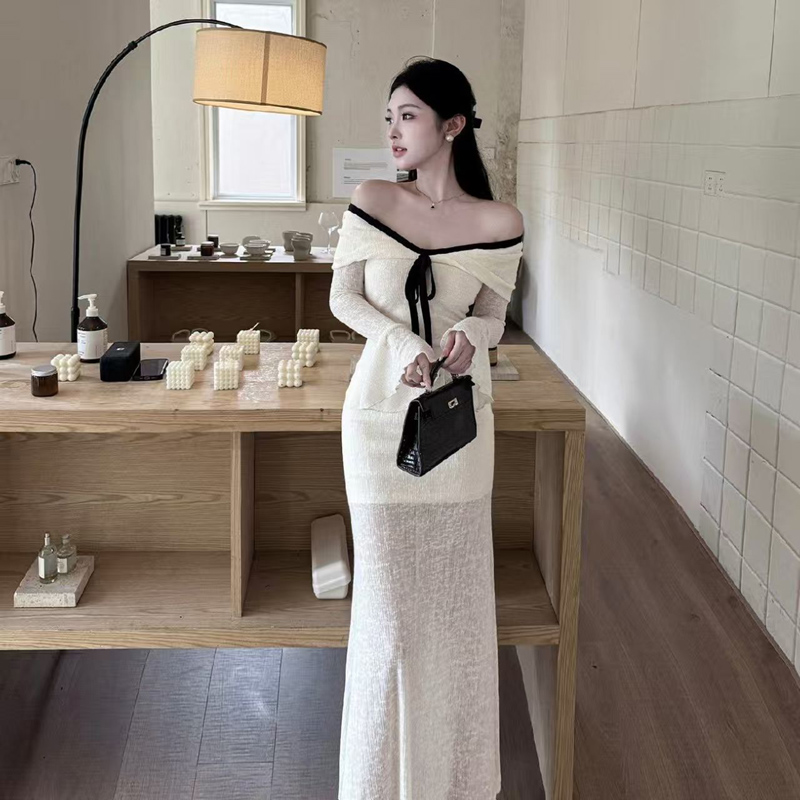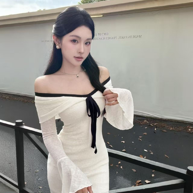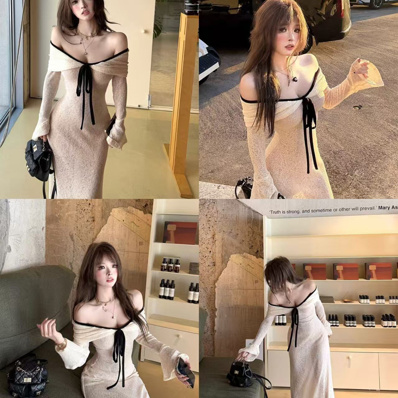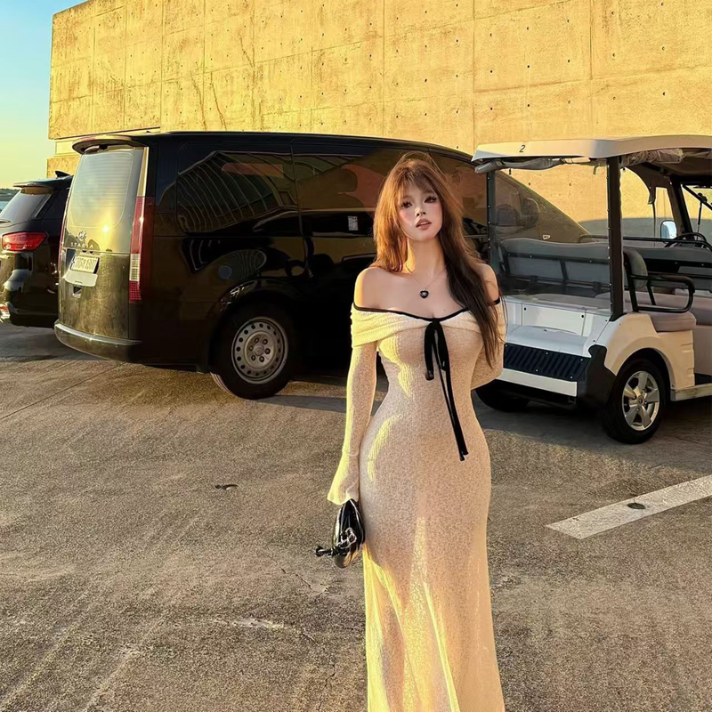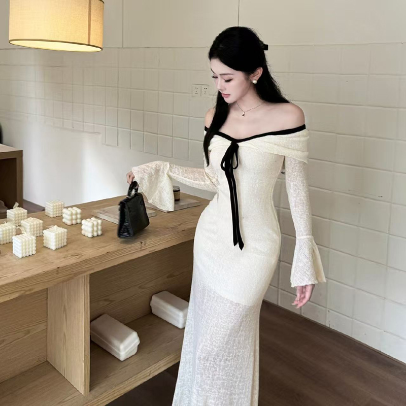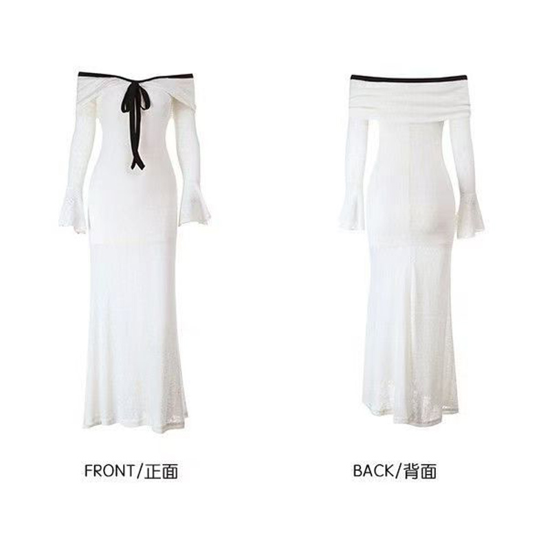 YF6272-(2色入内)性感时尚一字肩系蝴蝶结长袖弹力收腰包臀蕾丝礼服长裙