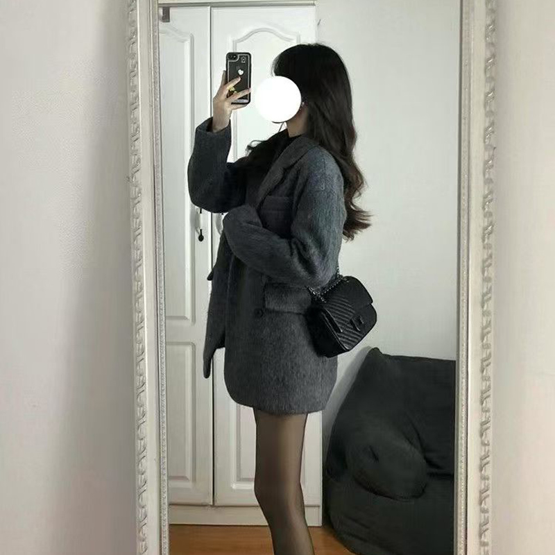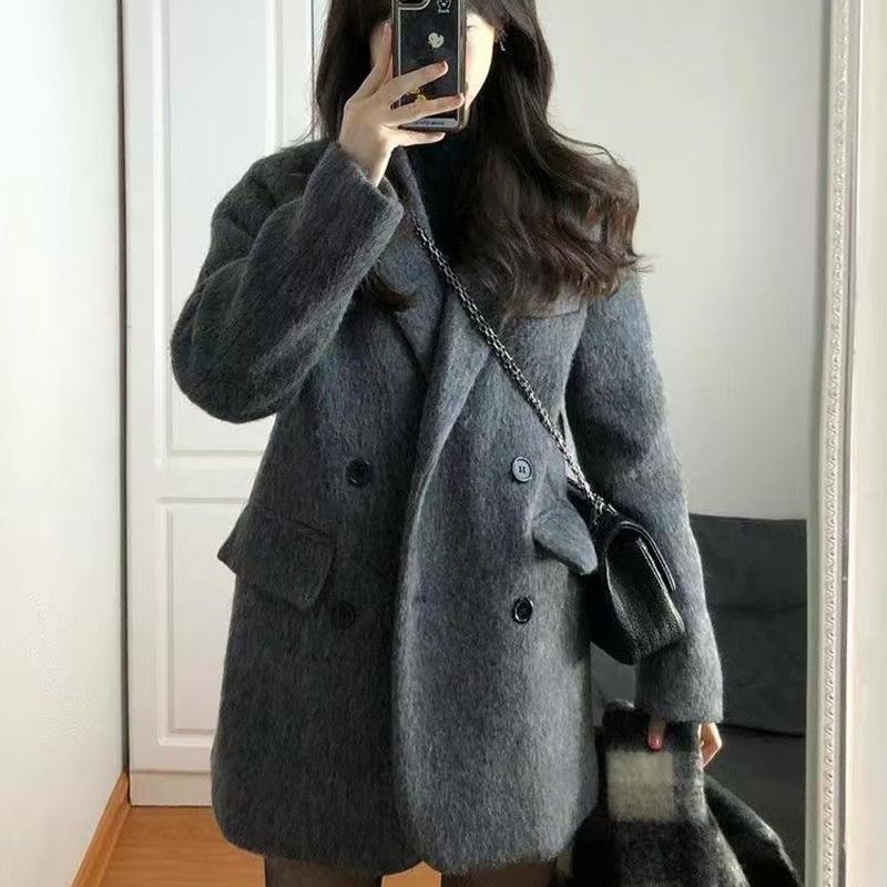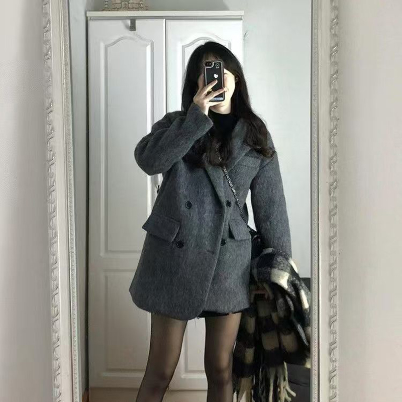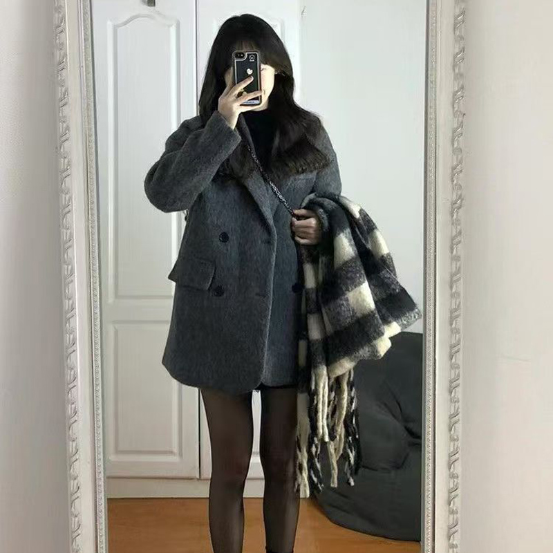 YF6274-图片色秋冬加厚西装领双排扣宽松大码学院风百搭短款毛呢外套上衣