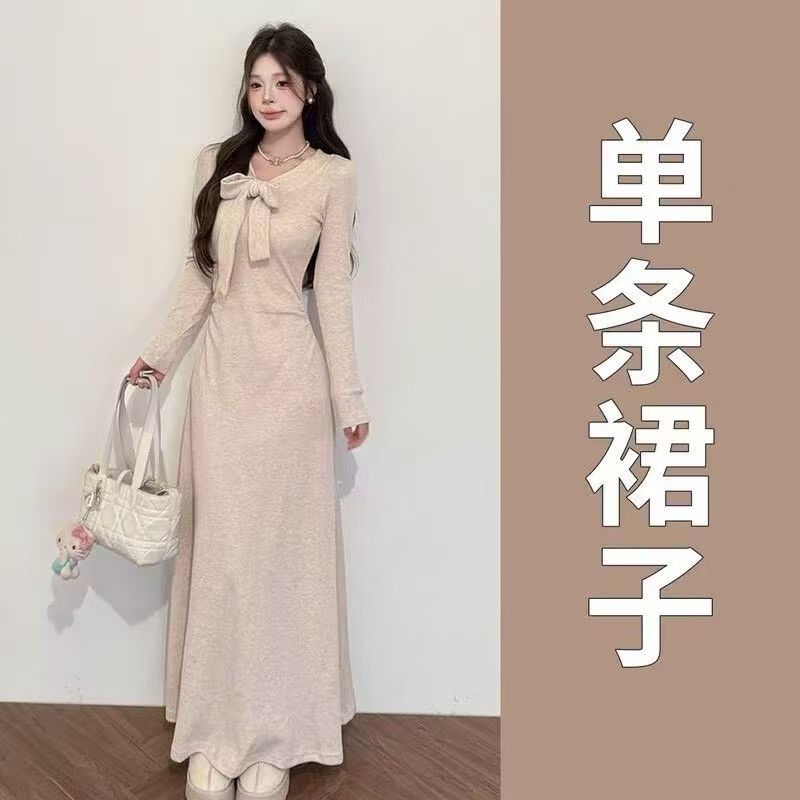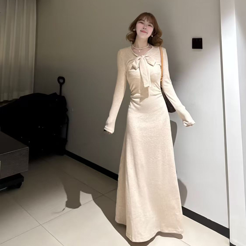 YF6275-图片色冬季别致新款长袖系蝴蝶结收腰中长款高级感针织连衣裙