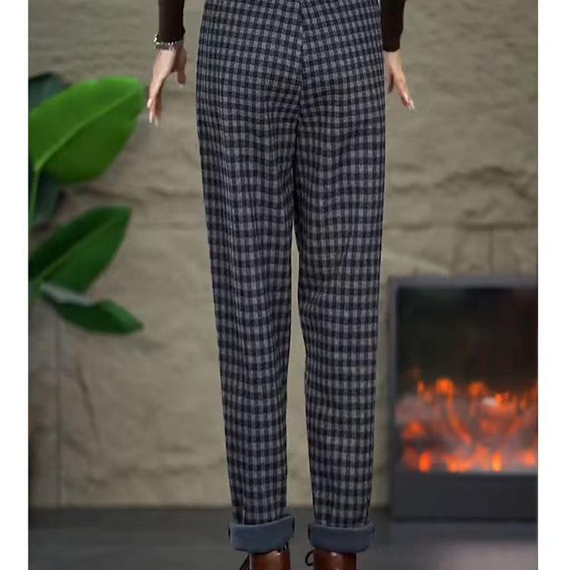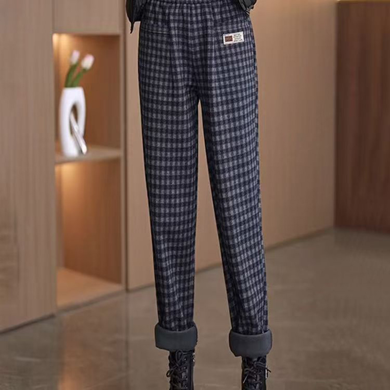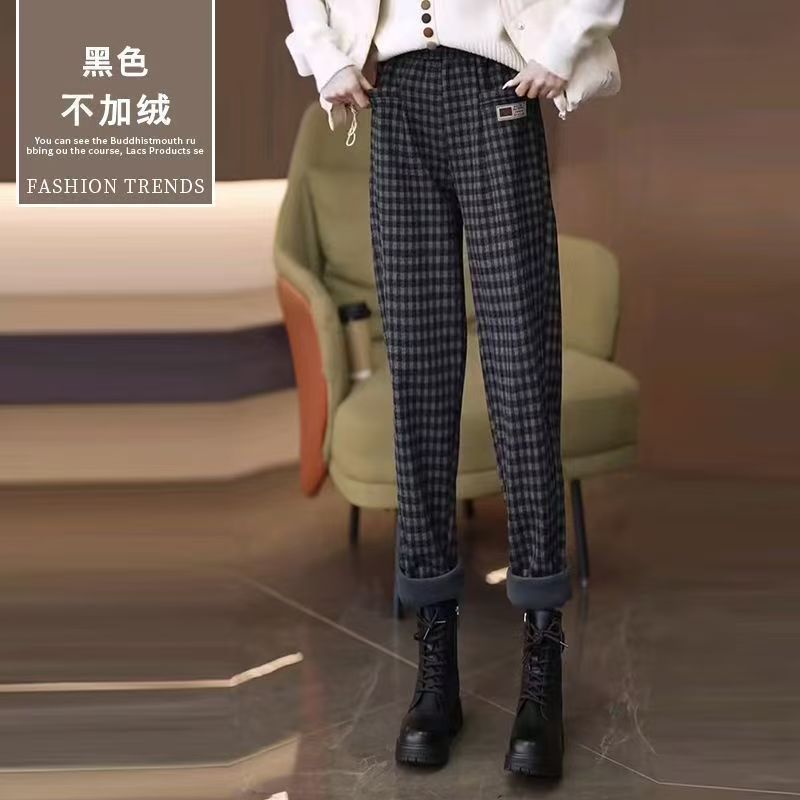 YF6277-图片色复古格子裤 秋冬加绒松紧腰贴标老爹款复古休闲萝卜铅笔裤
