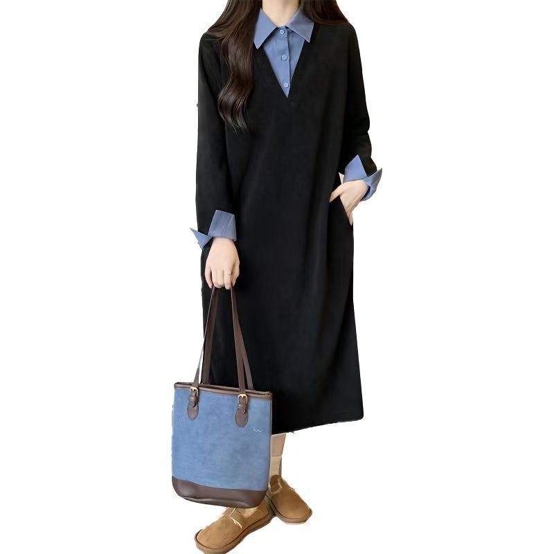 YF6282-(3色入内)慵懒风假两件拼接宽松显瘦直筒POLO领长袖小众秋冬长裙