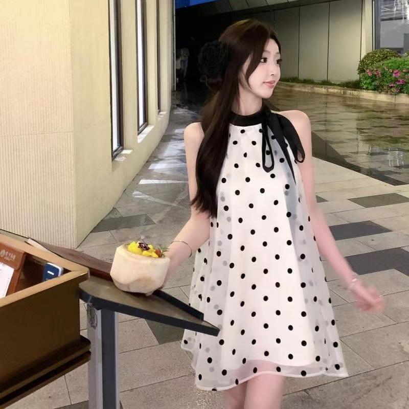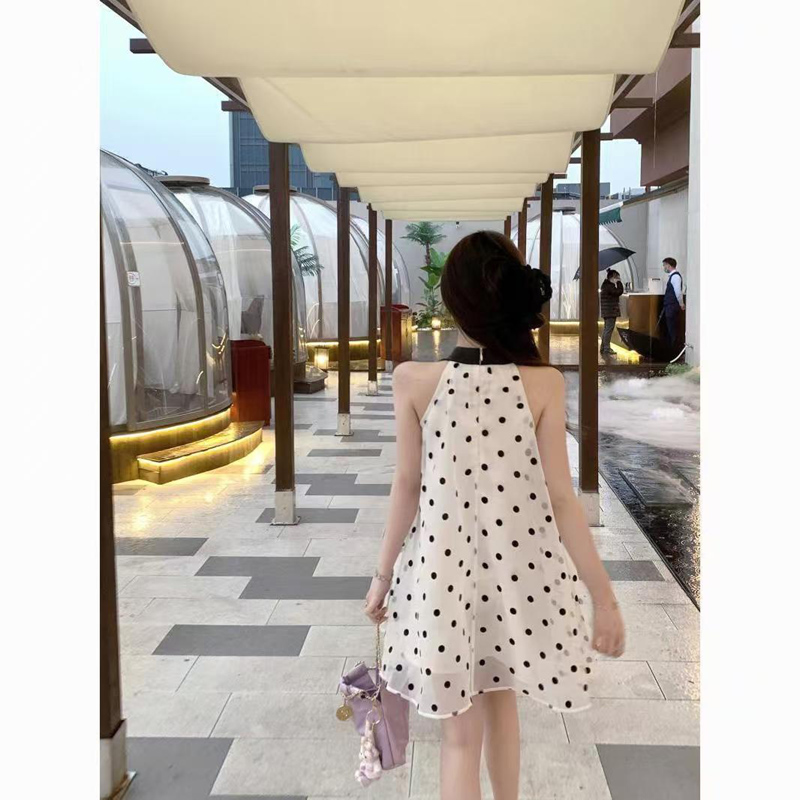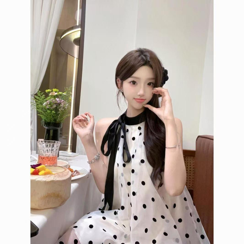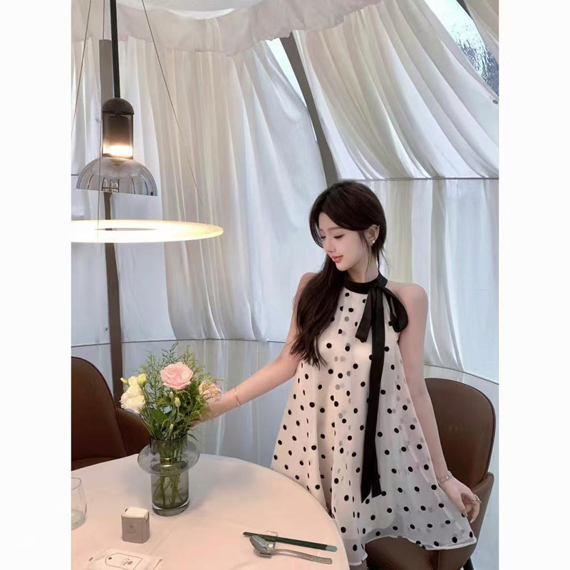YF6284-图片色性感时尚无袖露肩黑色围边系带蝴蝶结波点设计a字雪纺连衣裙