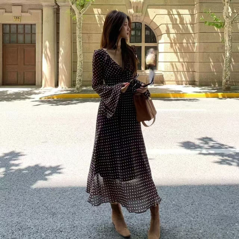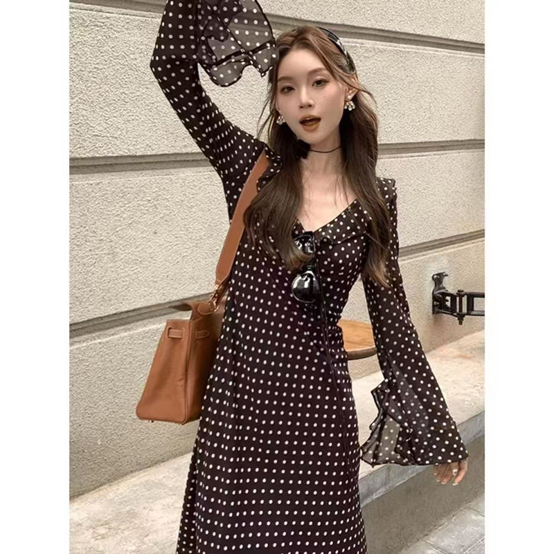 YF6286-图片色优雅时尚黑白波点喇叭袖V领收腰大摆显瘦春秋打底连衣裙