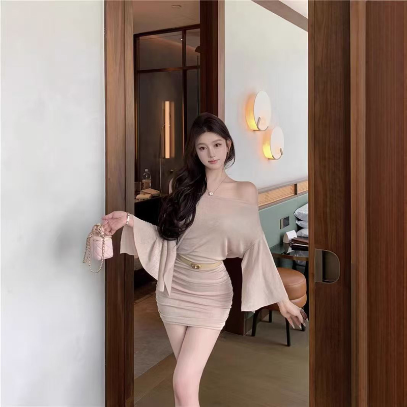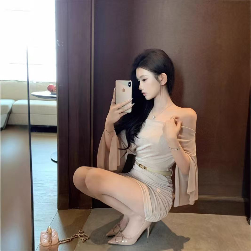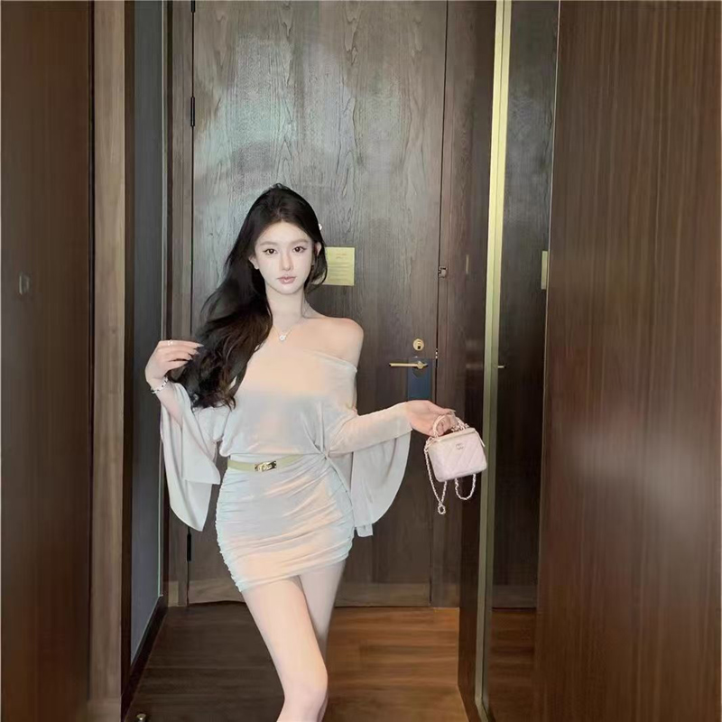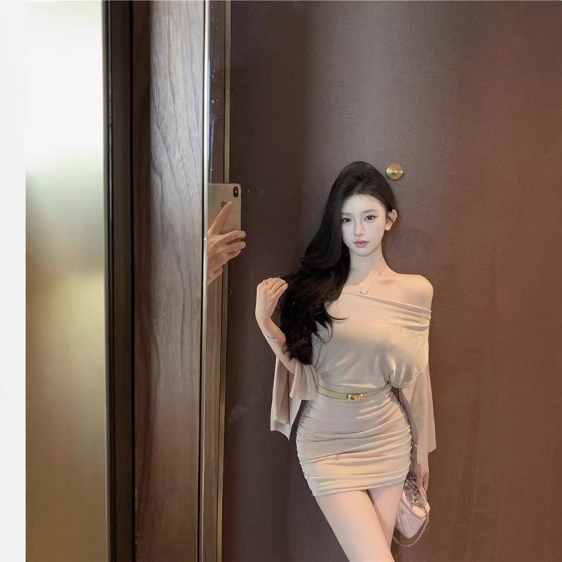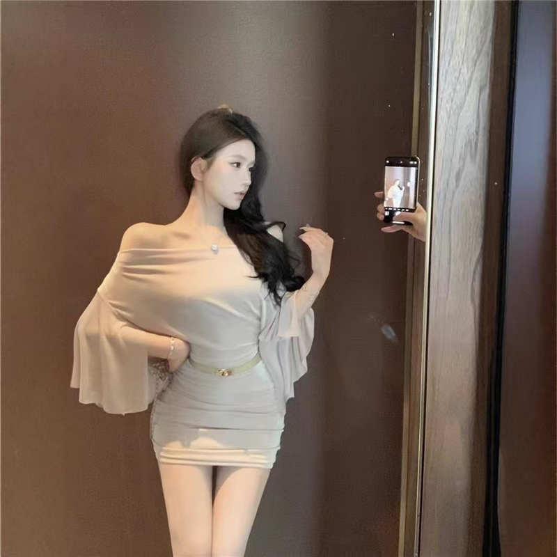 YF6296-(2色入内)性感辣妹开叉中袖露肩弹力包臀显瘦褶纯色夜店风礼服裙