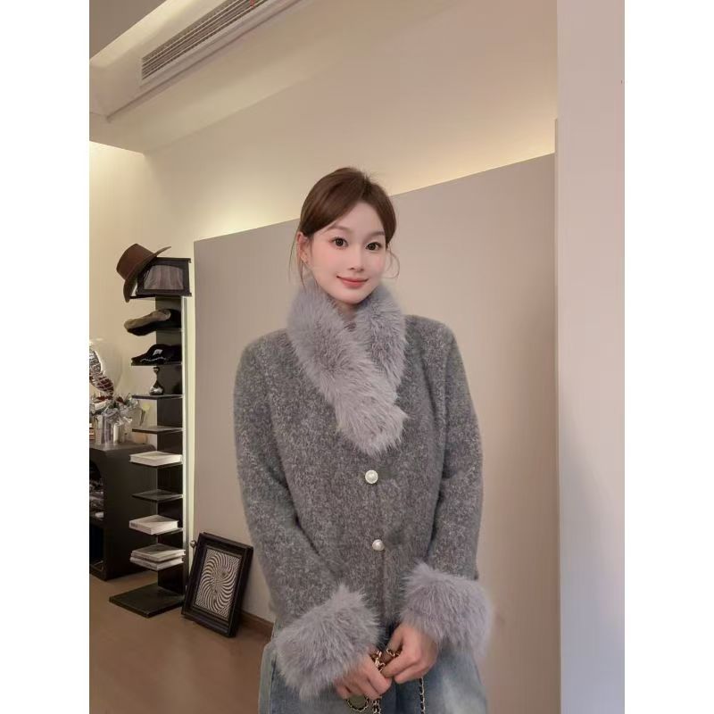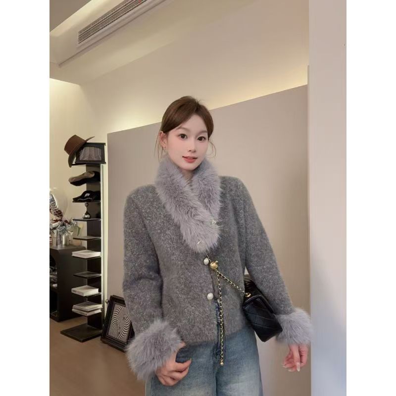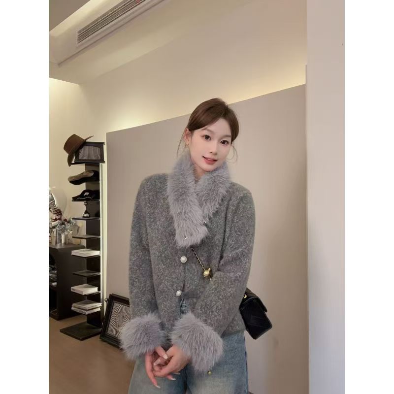 YF6299-图片色名媛气质可拆毛毛领系扣毛呢保暖冬装短款开衫外套冬季新款