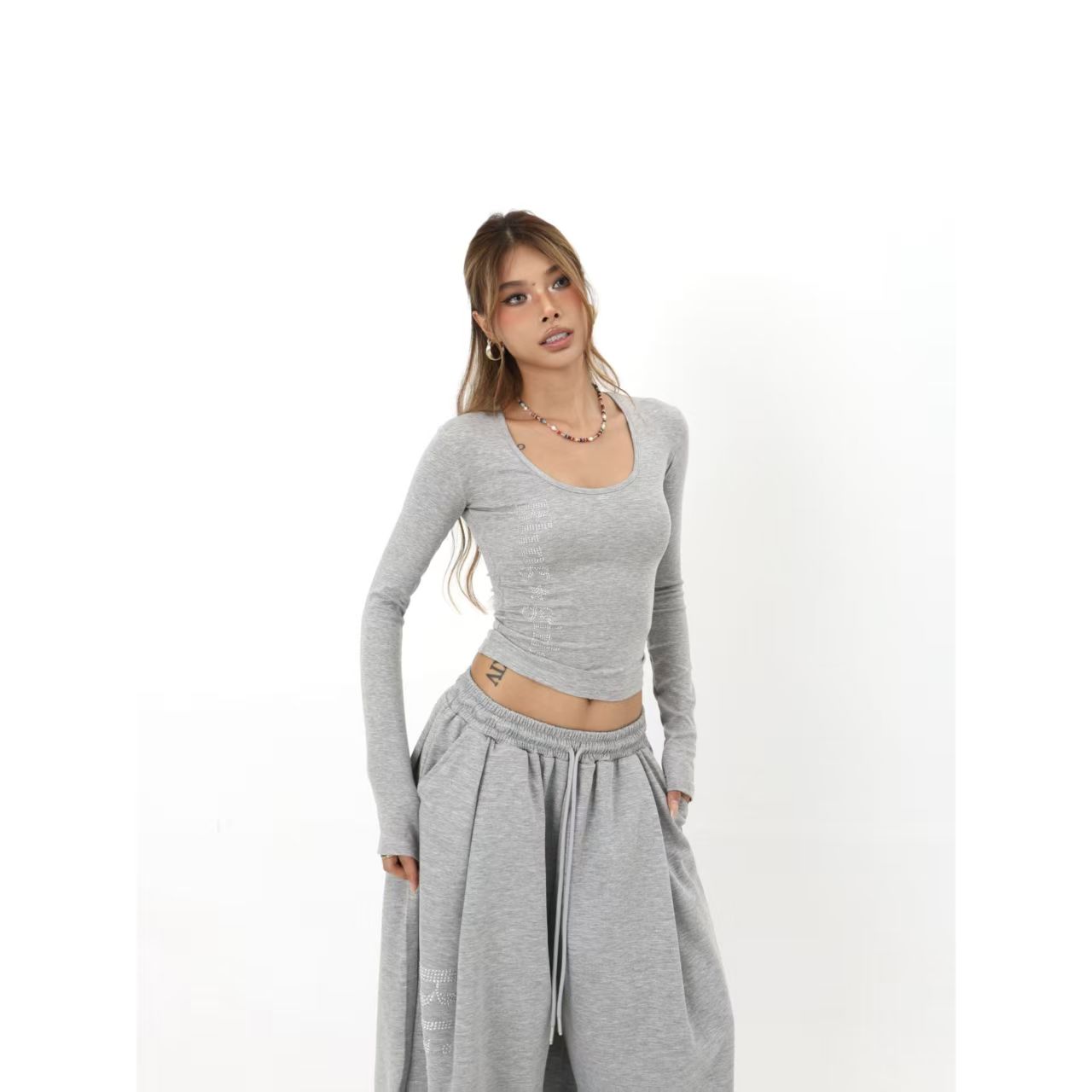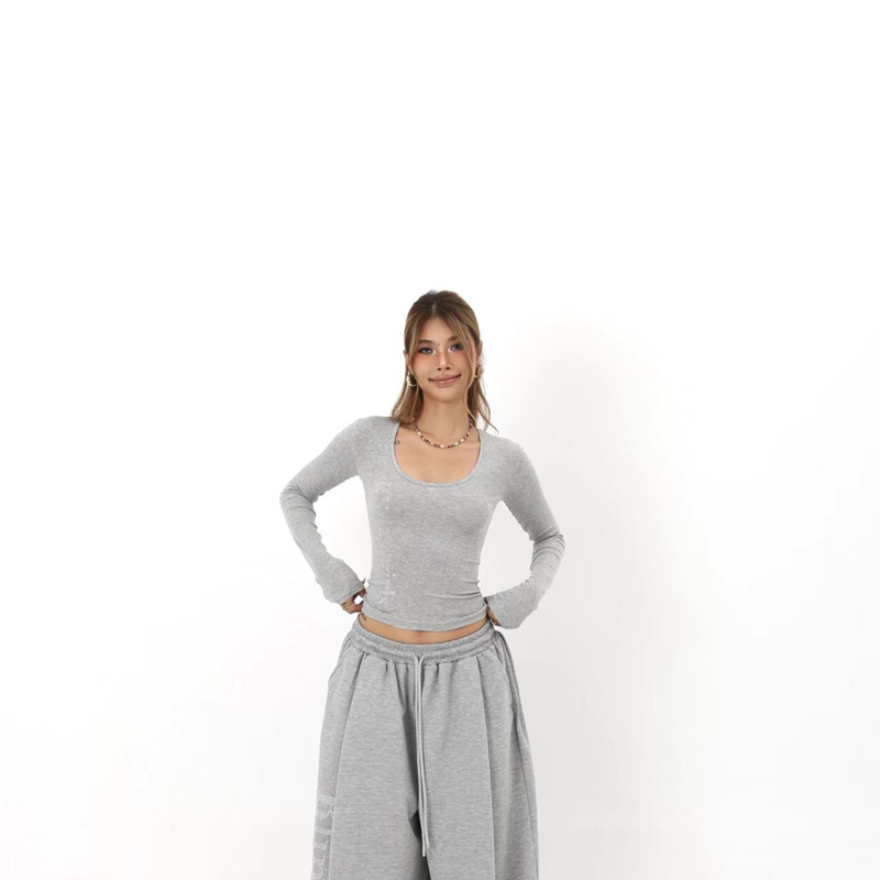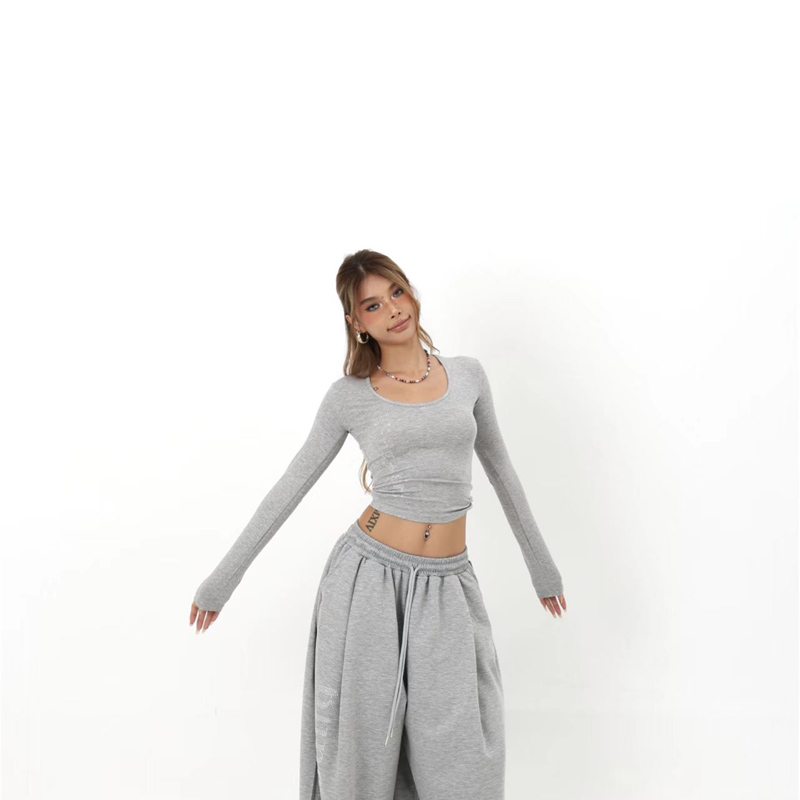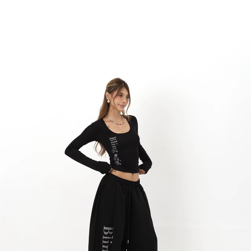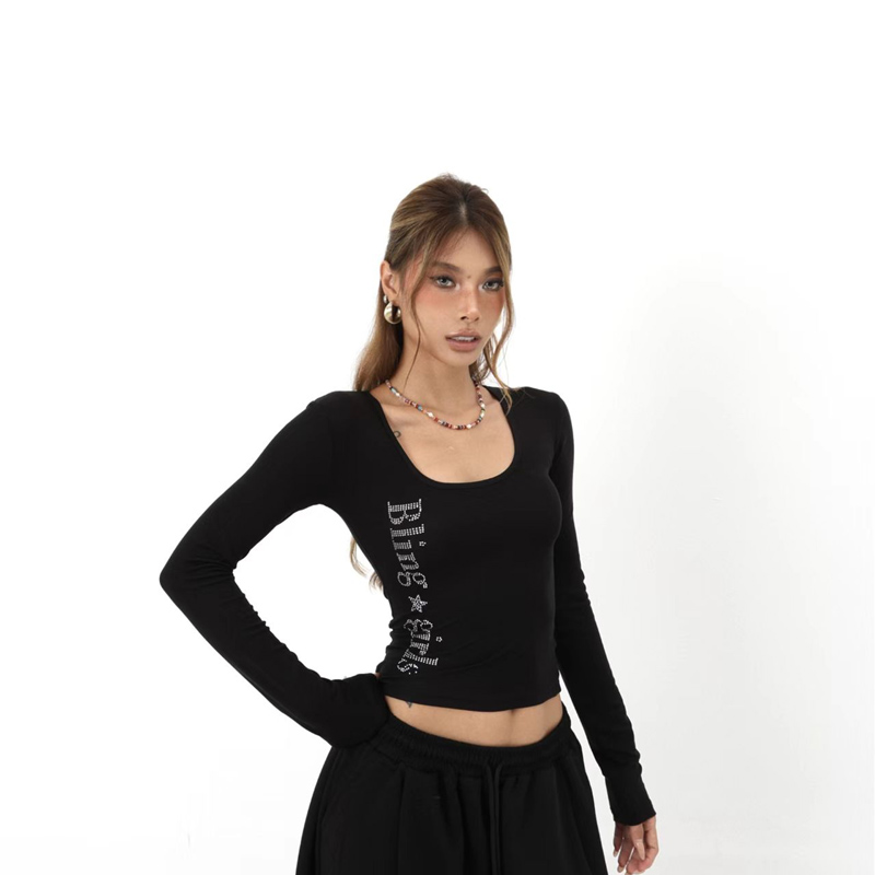 YF6304-(2色入内)时尚字母烫钻个性气质长袖U领短款修身弹力长袖T恤
