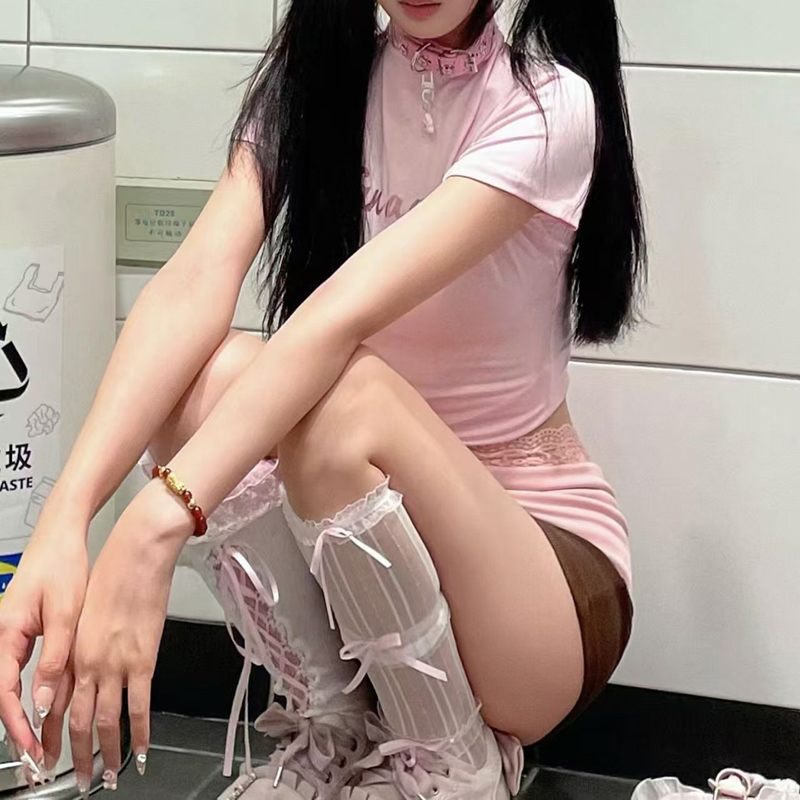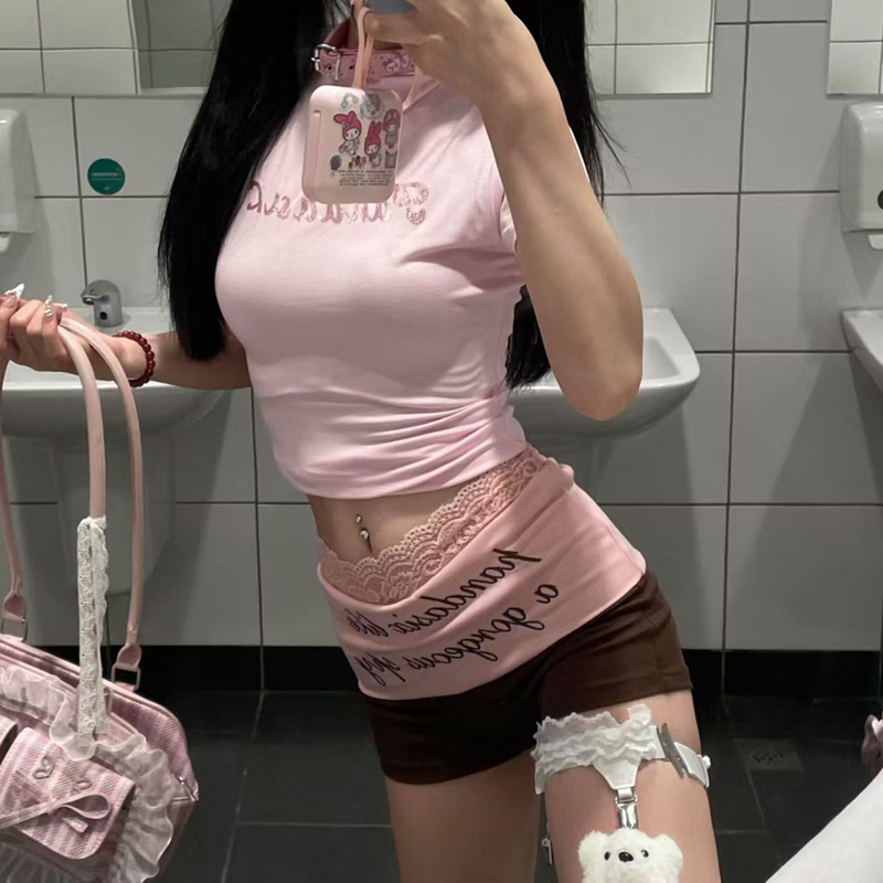 YF6305-图片色纯欲风字母刺绣撞色拼接蕾丝短裤 辣妹弹力紧身包臀热裤