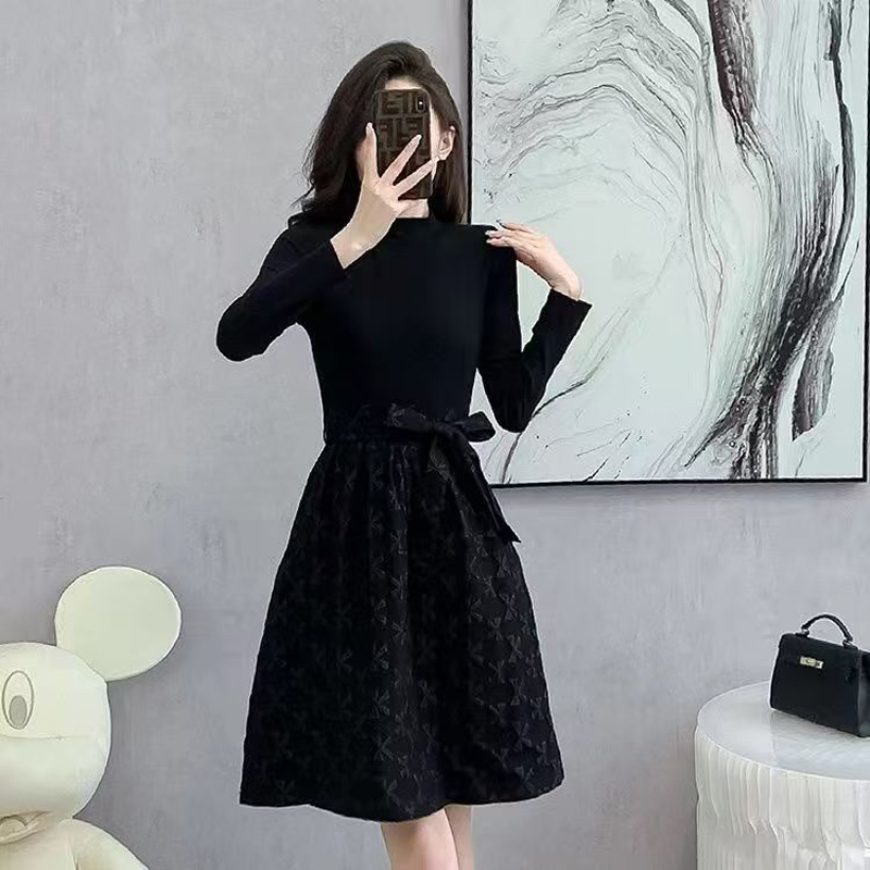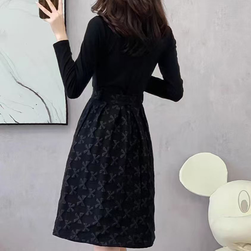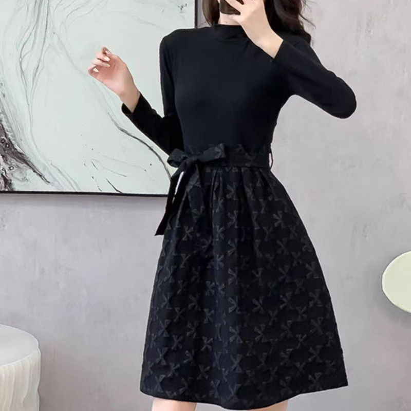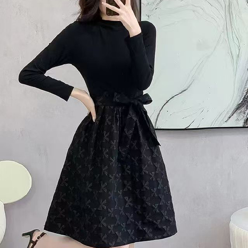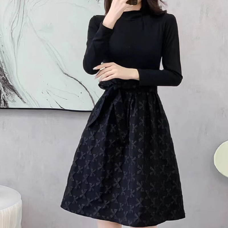 YF6307-图片色赫本风秋冬百搭圆领长袖拼接系蝴蝶结提花优雅气质连衣裙