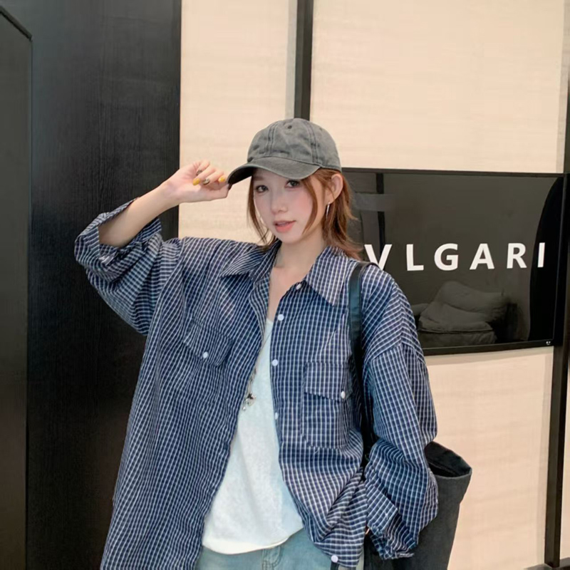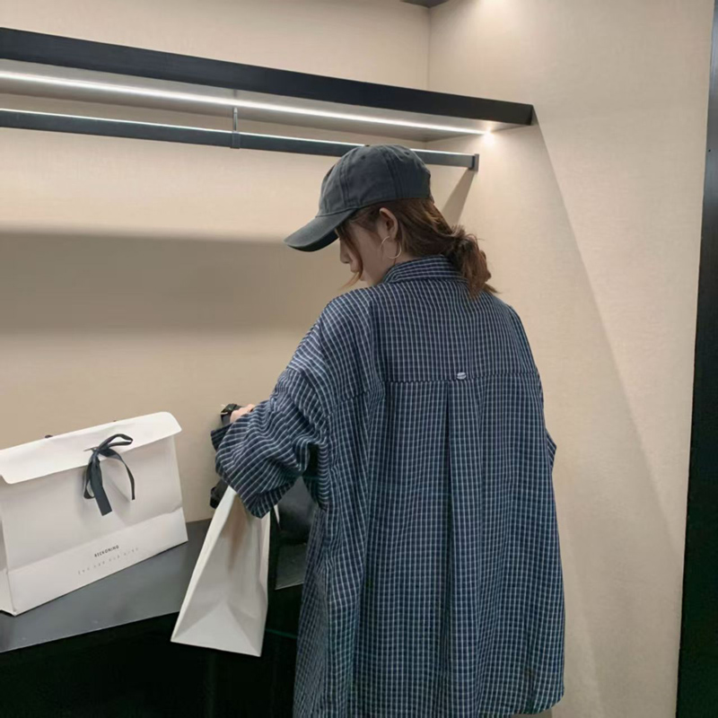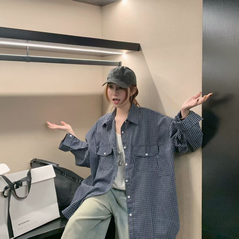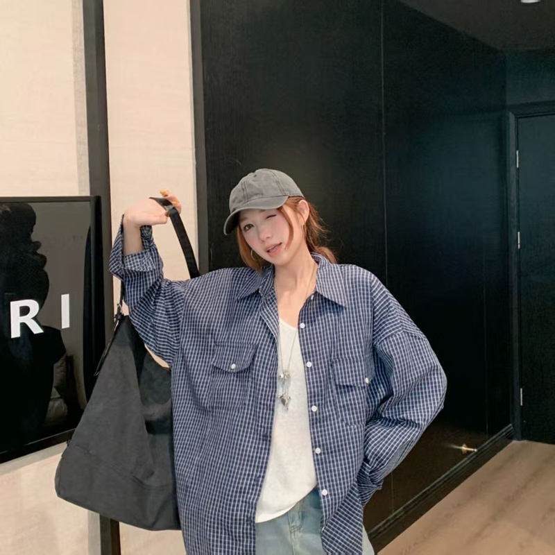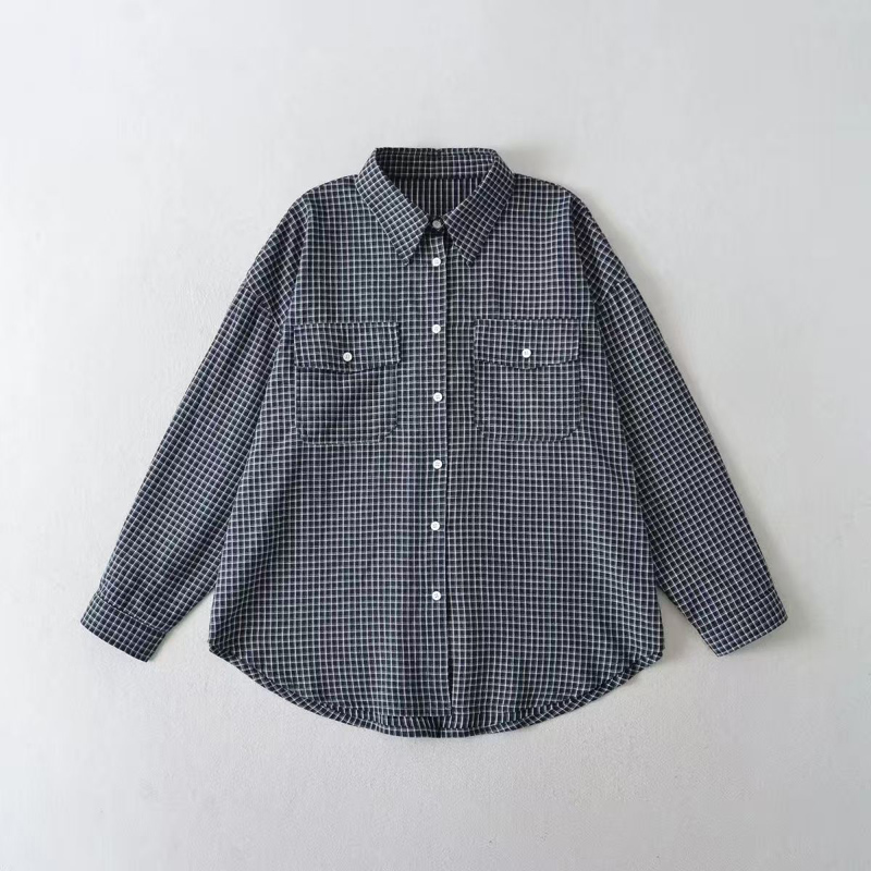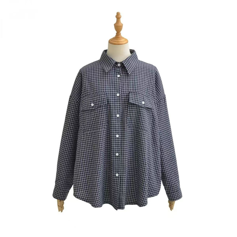YF6308-图片色慵懒风长袖翻领复古格子宽松大码显瘦双口袋设计港式衬衣
