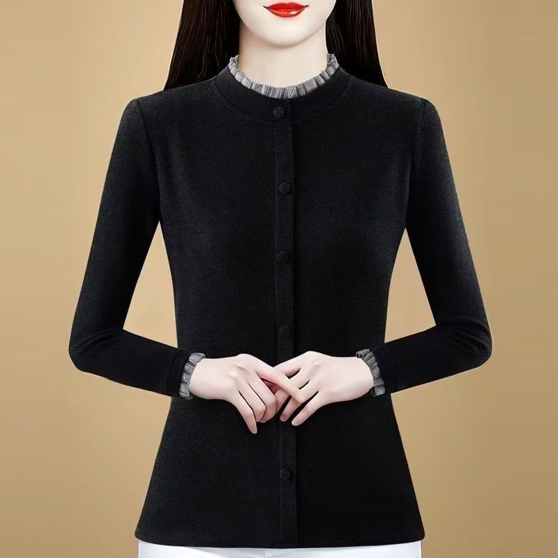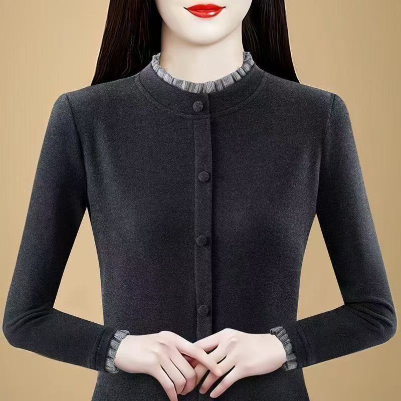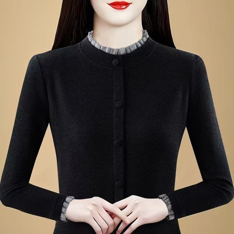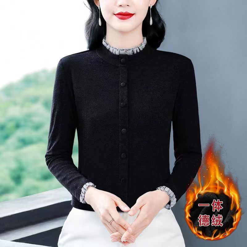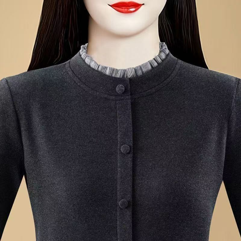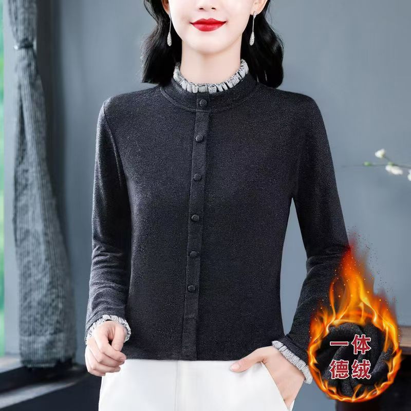YF6311-(2色入内)双面绒亲肤花边撞色领复古风设计长袖排扣宽松显瘦上衣