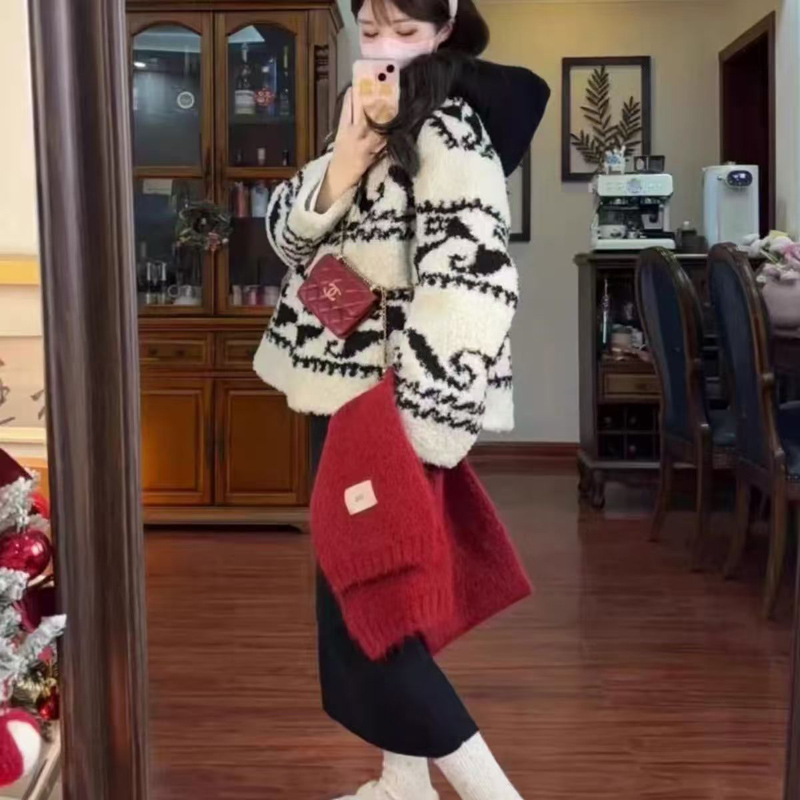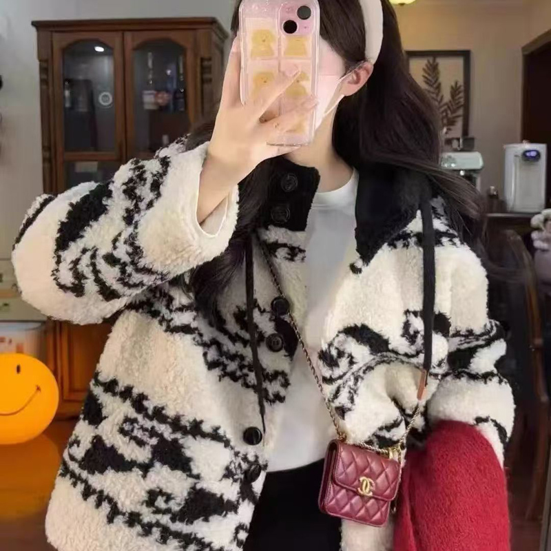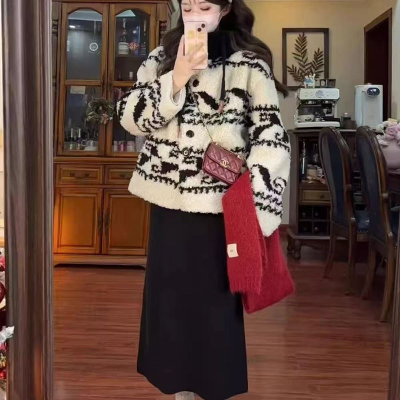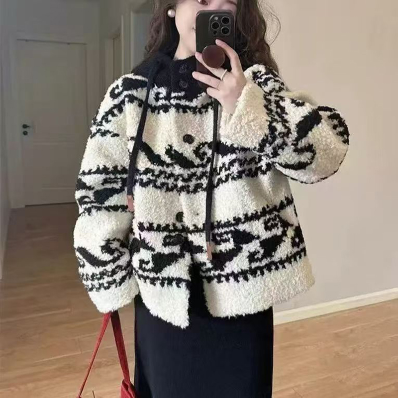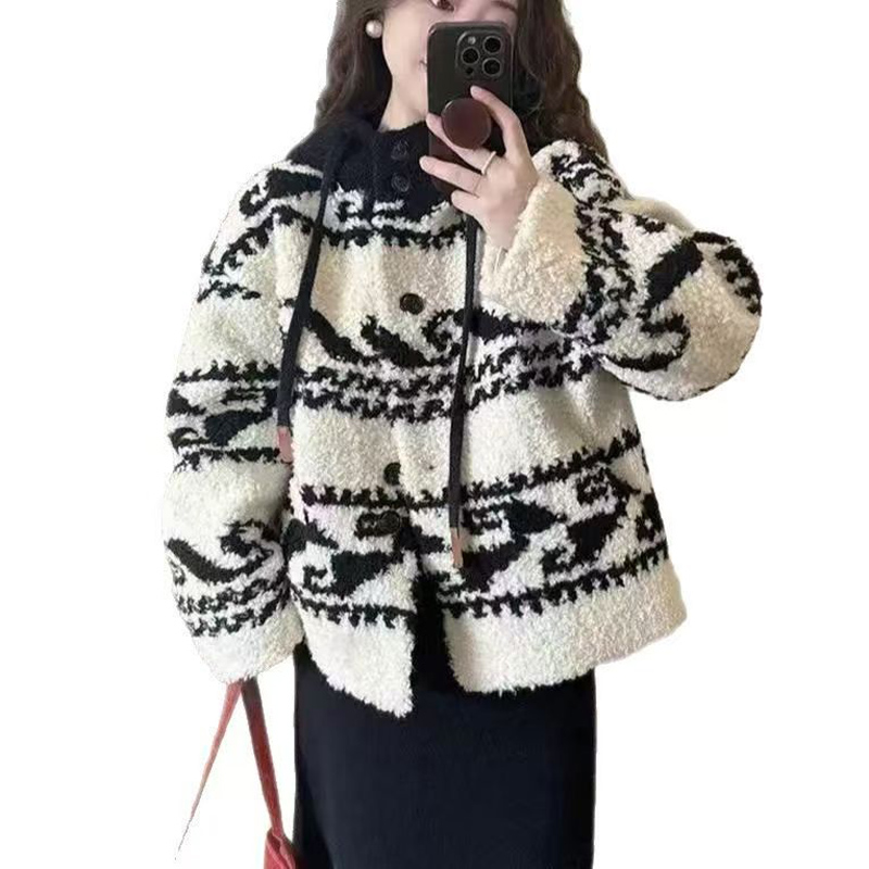 YF6315-图片色冬季不规则图腾印花民族风长袖撞色领系扣宽松大码加绒外套