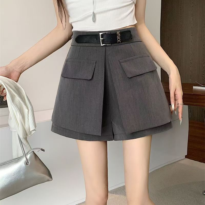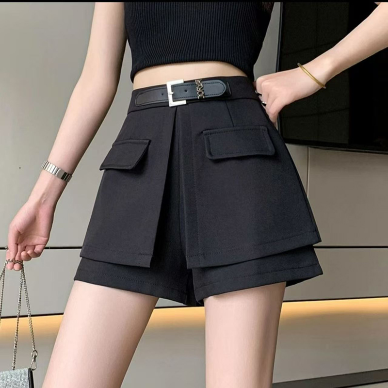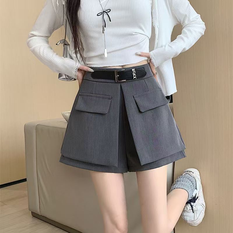 YF6317-(2色入内)韩版辣妹百搭系皮带可调设计高腰A字工装口袋阔腿短西裤