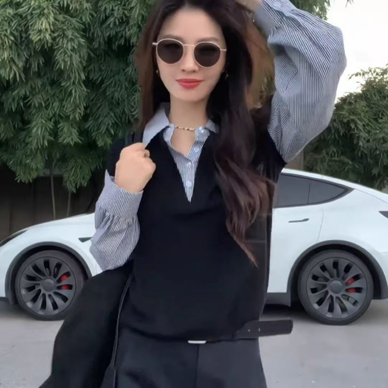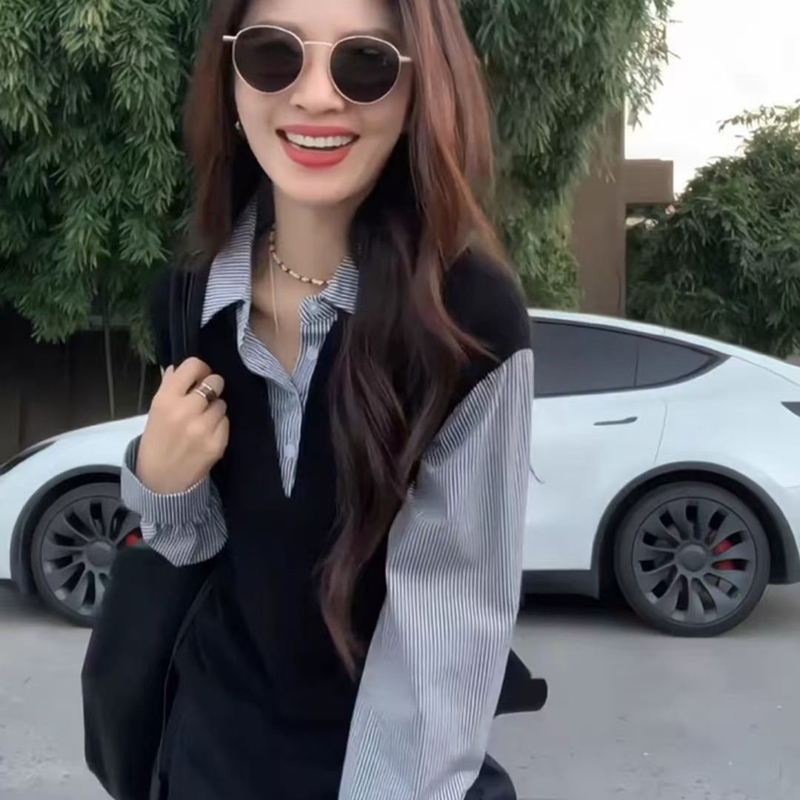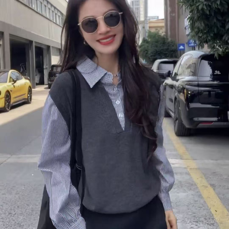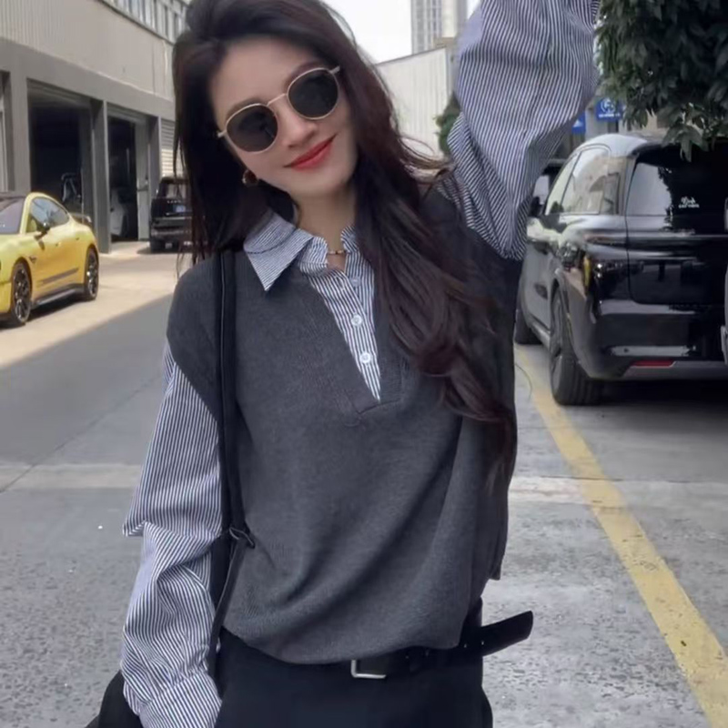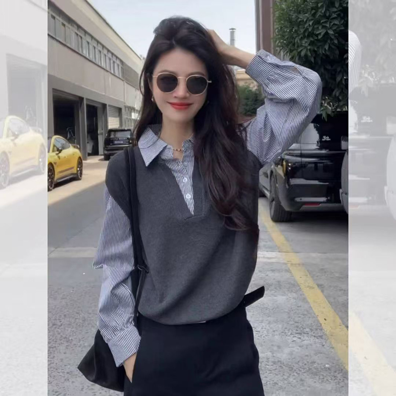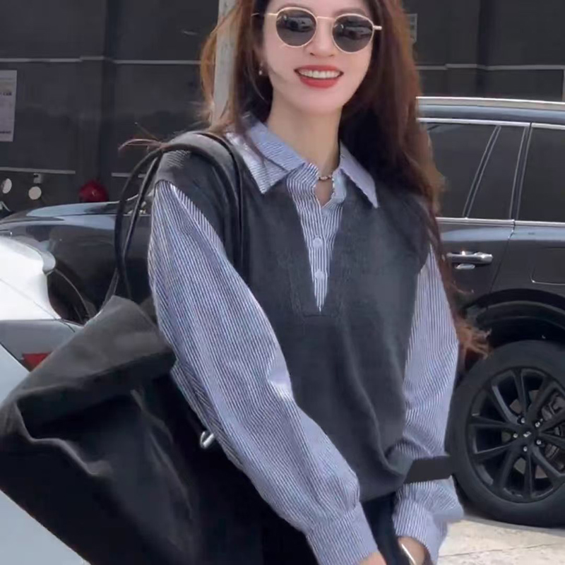 YF6318-(2色入内)假两件条纹接拼长袖翻领系扣V领宽松大码文艺风上衣