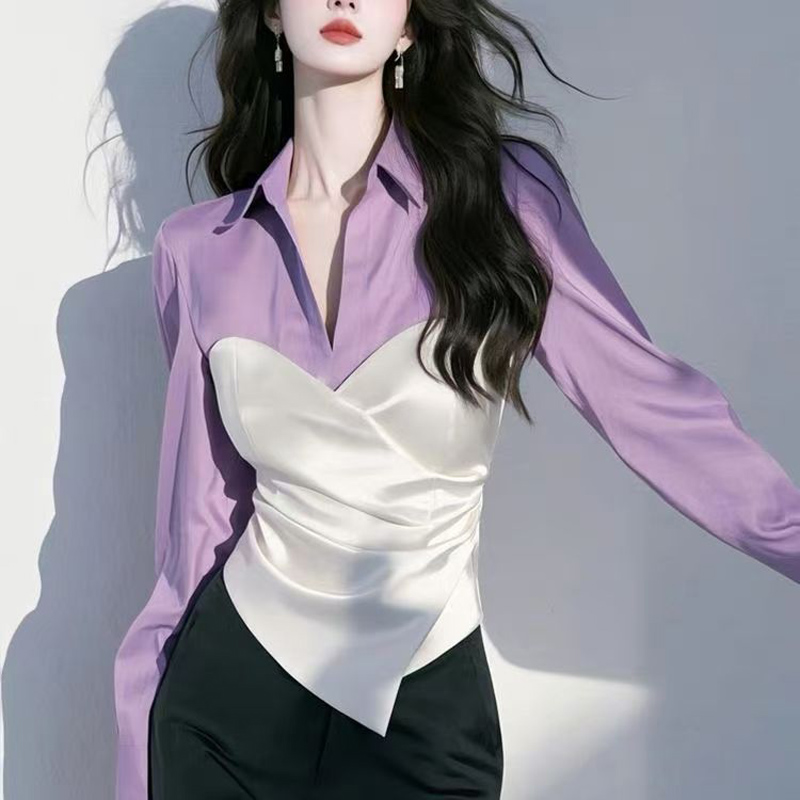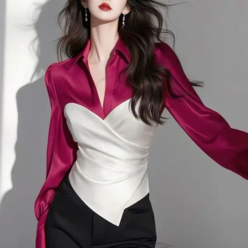 YF6319-(5色入内)别致设计泡泡袖翻领撞色拼接褶折交叉修腰高级感衬衣