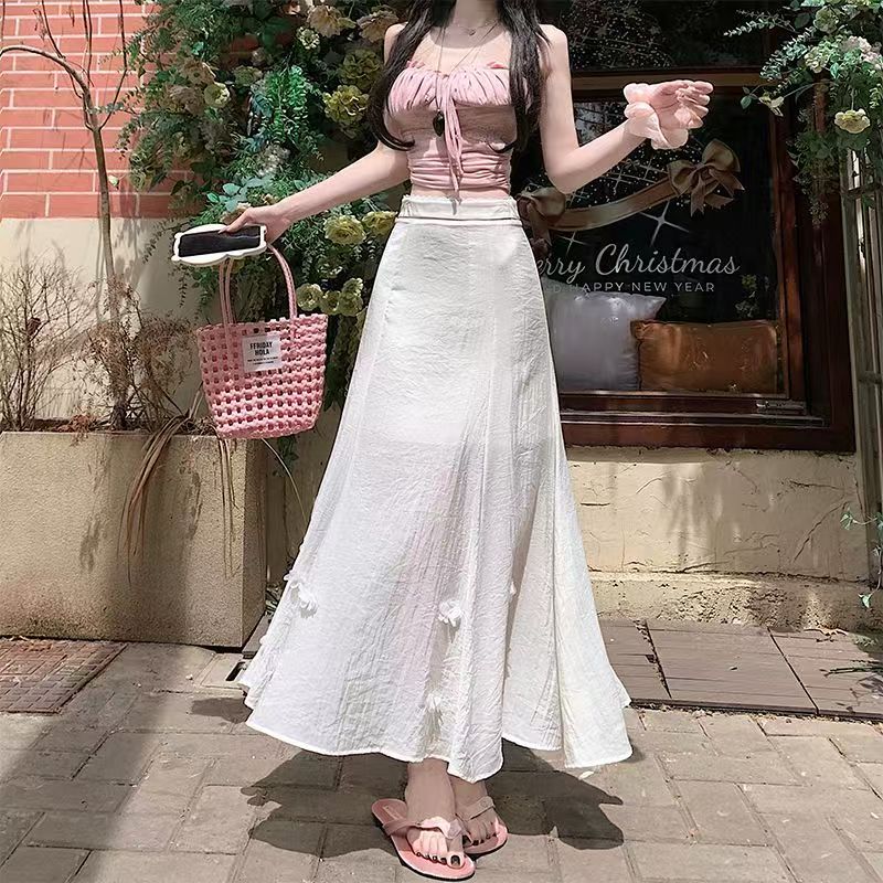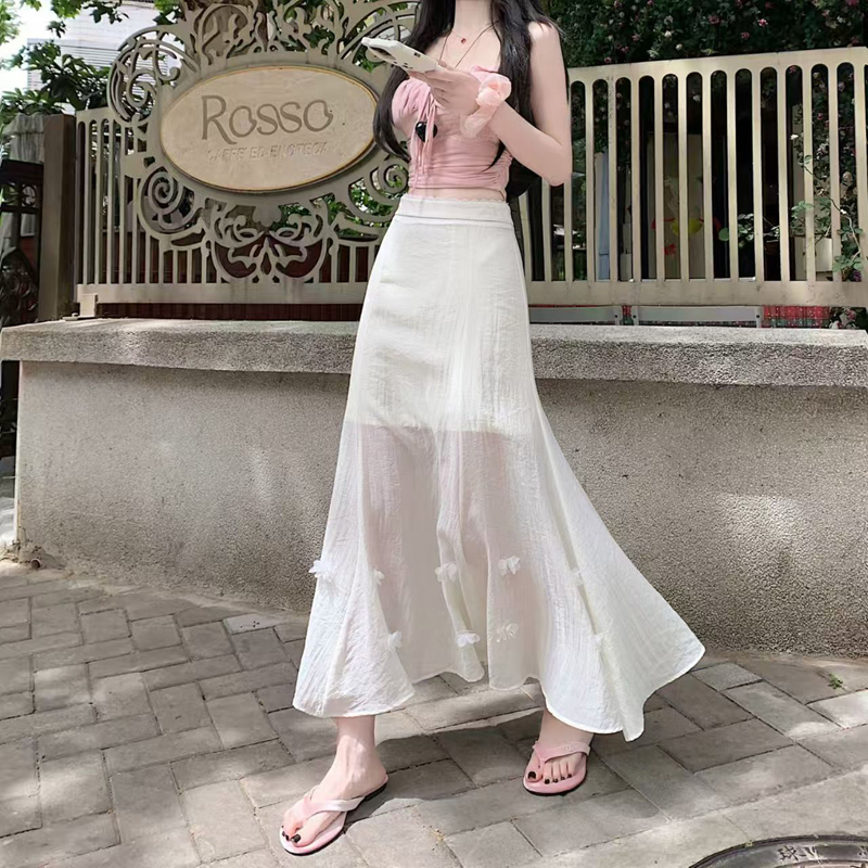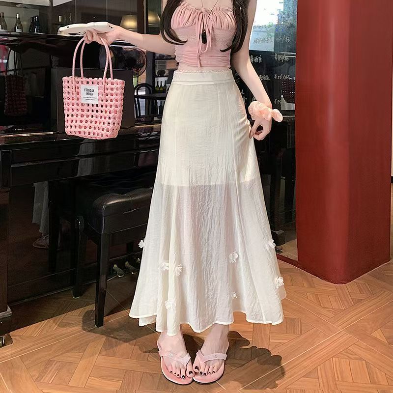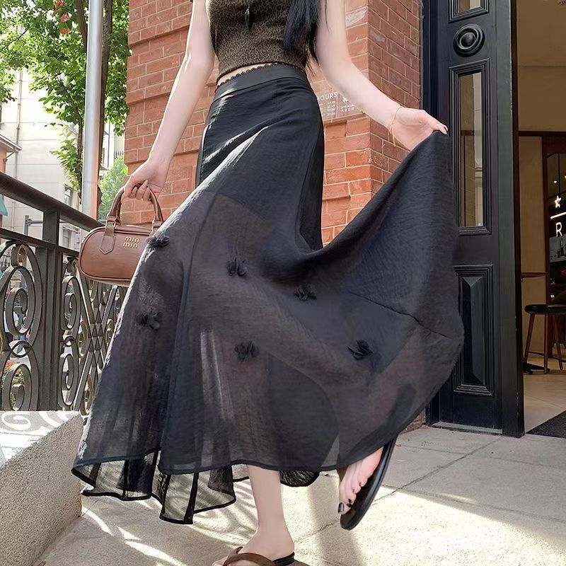 YF6322-(2色入内)优雅飘逸收腹高腰字中长款大摆立体玫瑰花设计百搭长裙