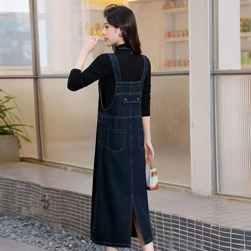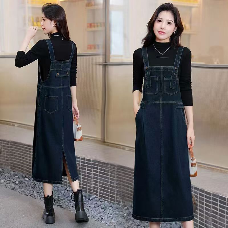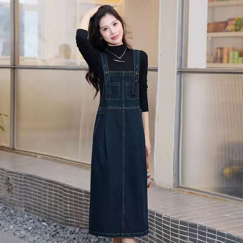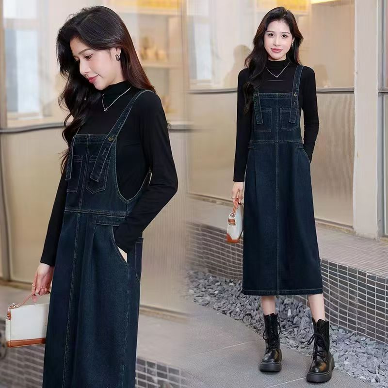 YF6324-图片色秋冬带插口袋宽松显瘦复古气质背带连体牛仔连衣裙