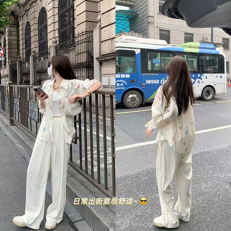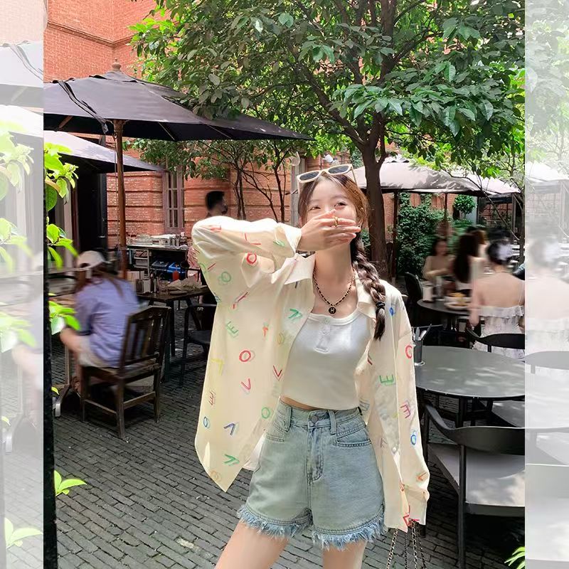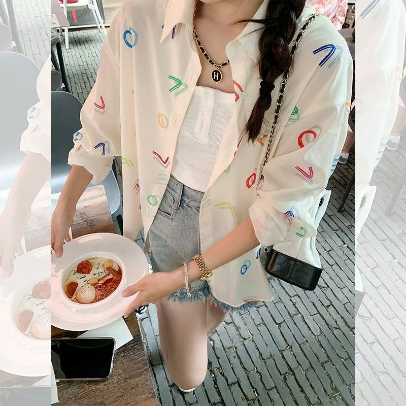 YF6334-图片色秋季个性彩色字母印花长袖翻领慵懒风大码日系休闲衬衫