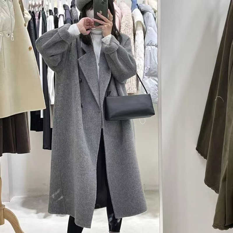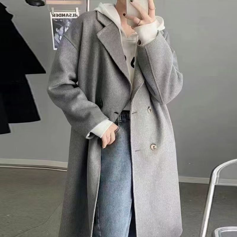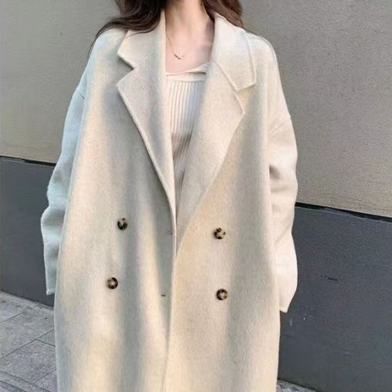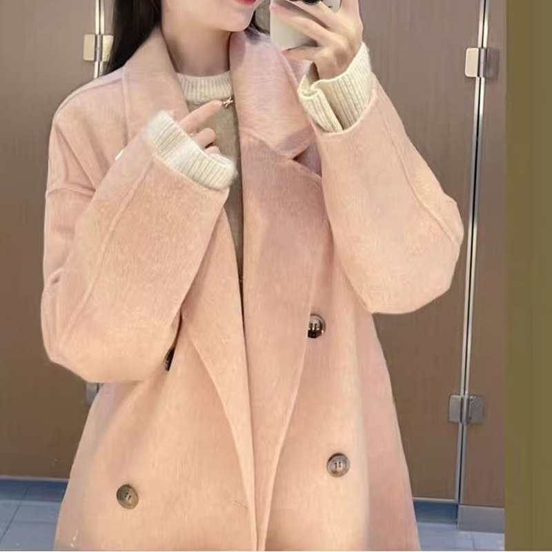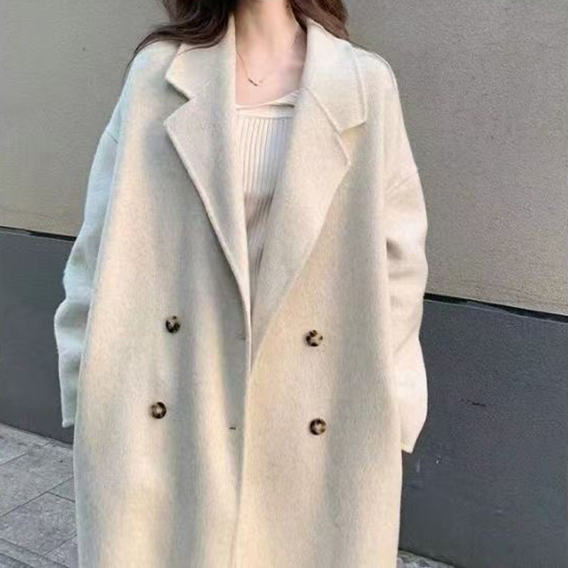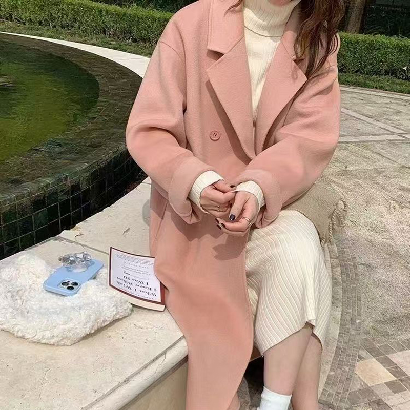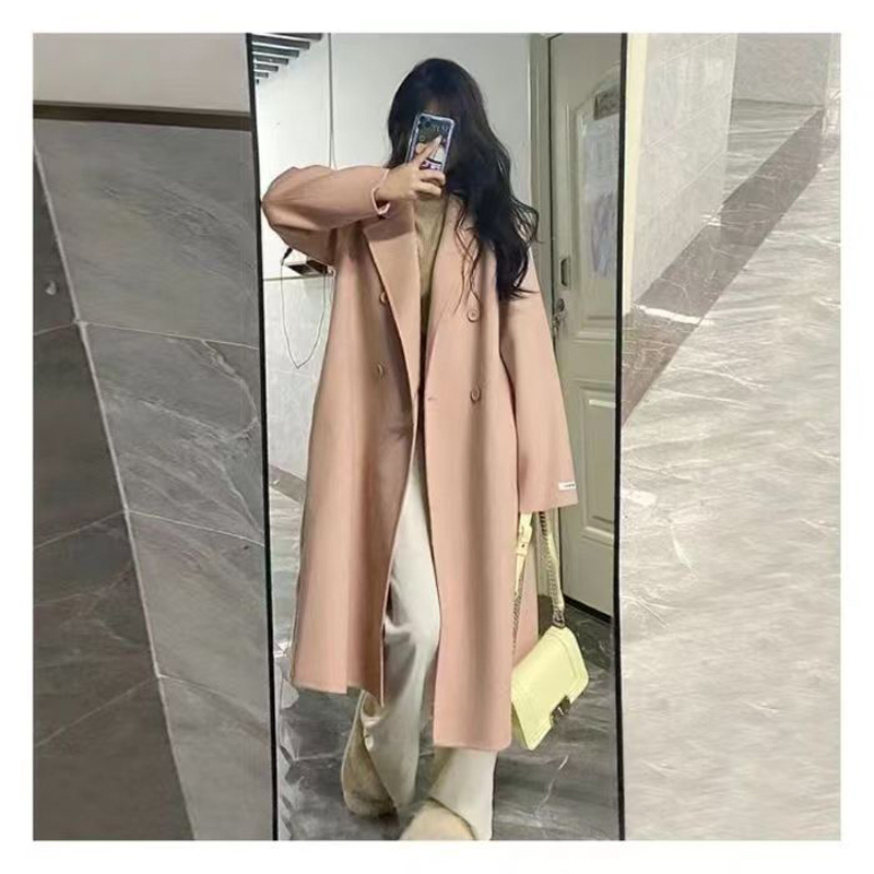 YF6336-(3色入内)双面呢高级感长袖西装领双排扣中长款过膝韩版毛呢大衣