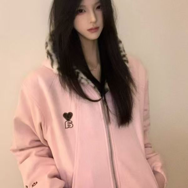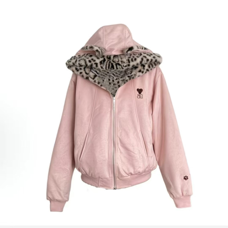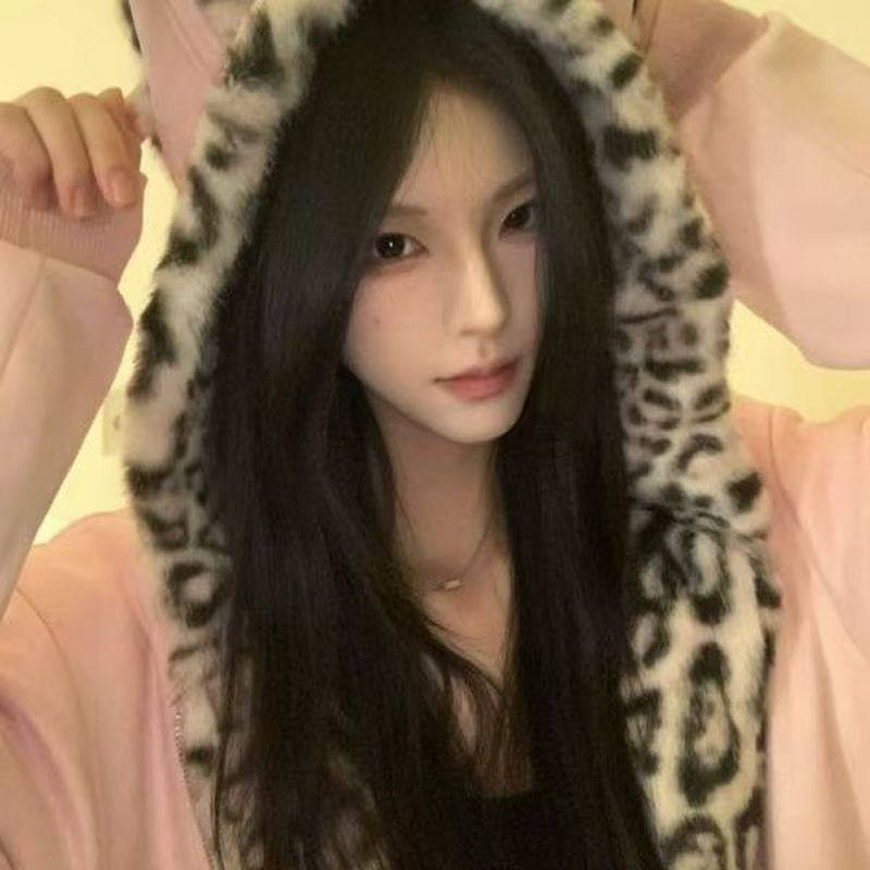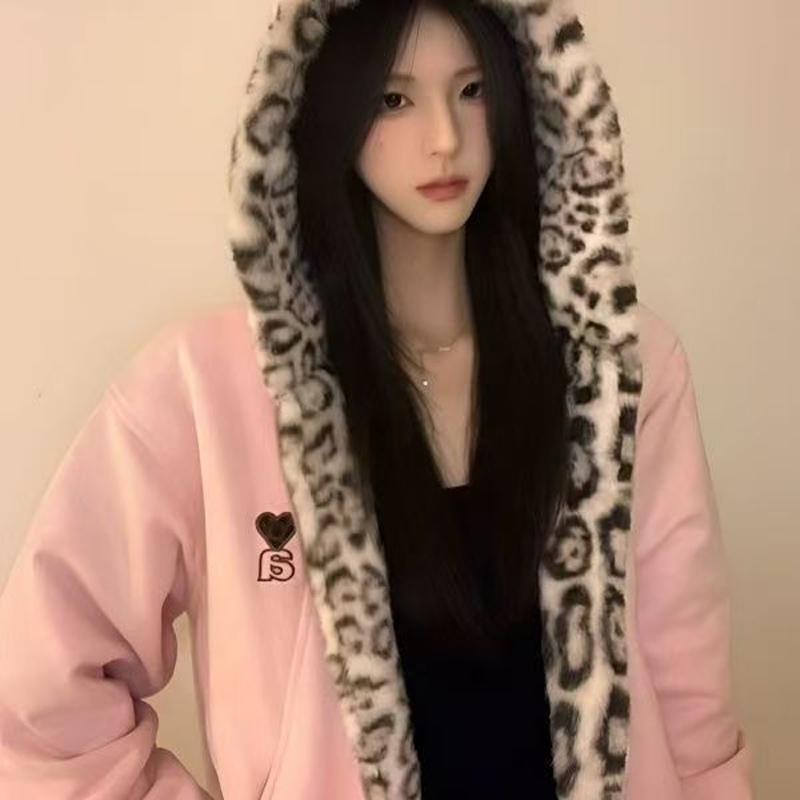 YF6337-图片色豹纹内里长袖连帽冬装加绒保暖胖MM显瘦慵懒风卫衣上衣