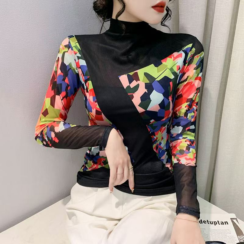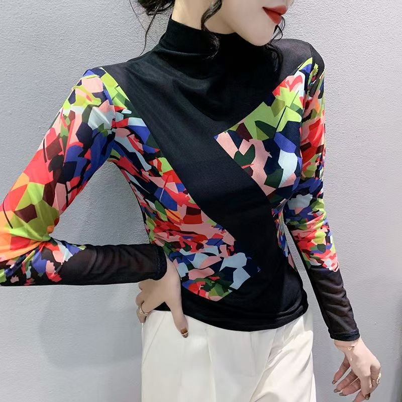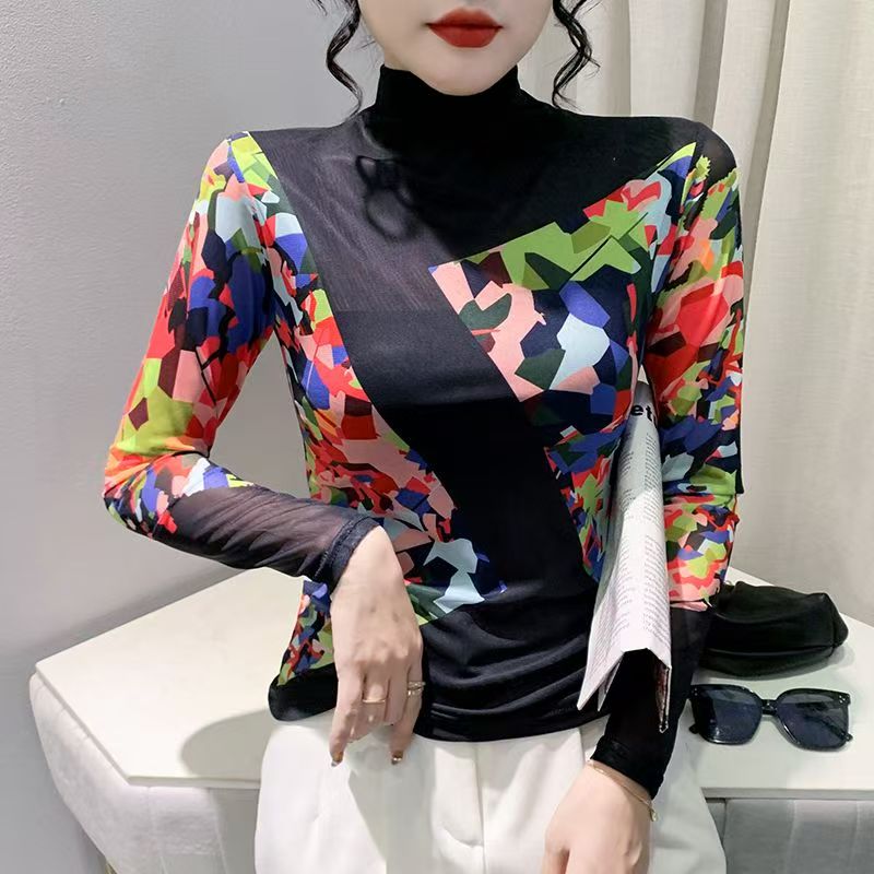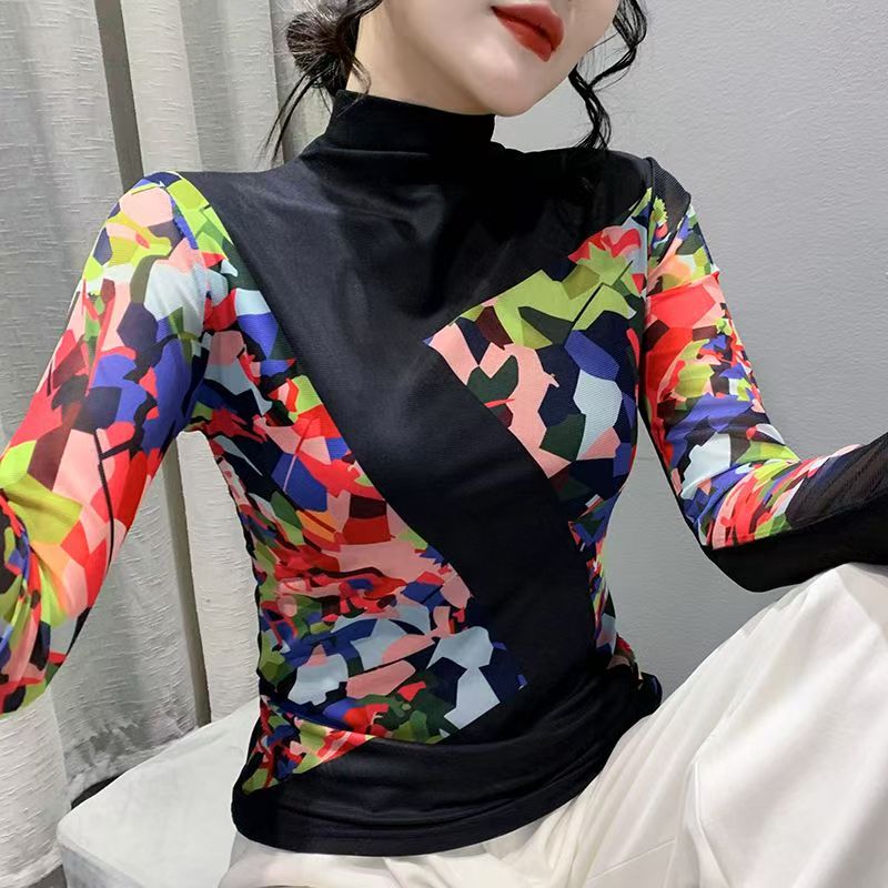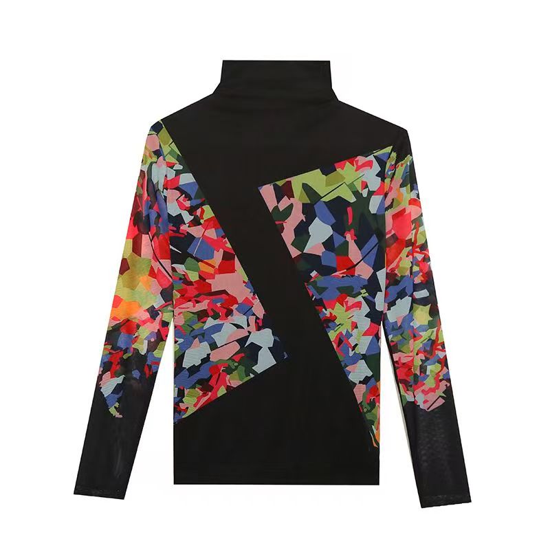YF6338-图片色不规则数码印花设计长袖半高领弹力显瘦秋冬修身打底衫