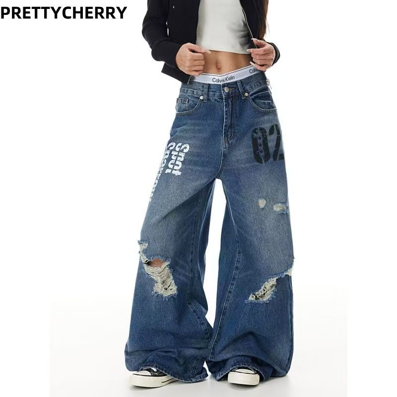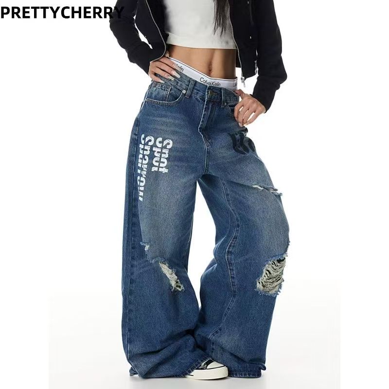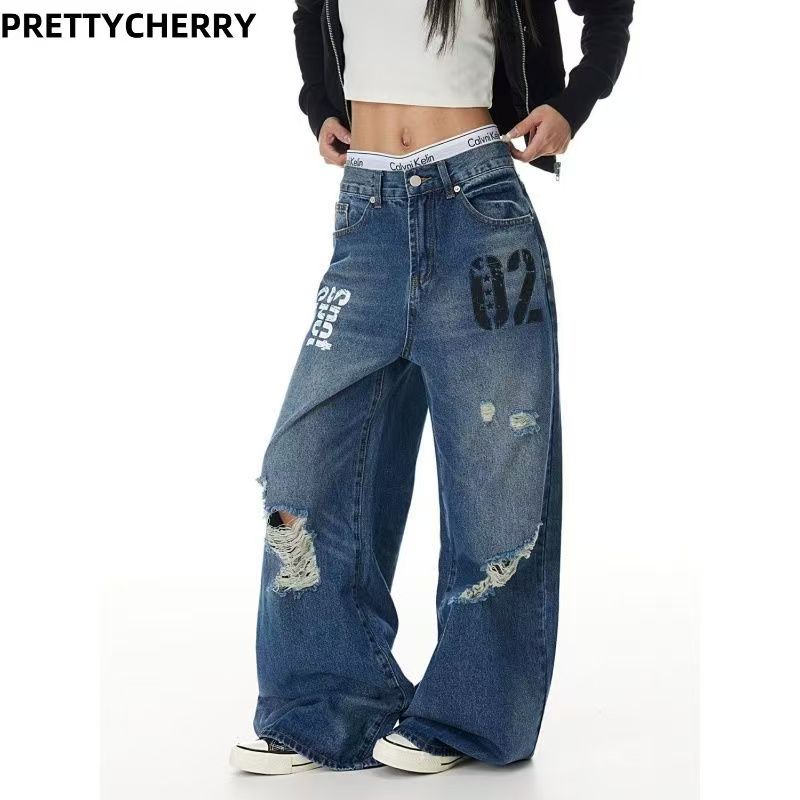 YF6344-图片色新款慵懒风破洞02字母印花直筒坠地感阔腿复古牛仔裤