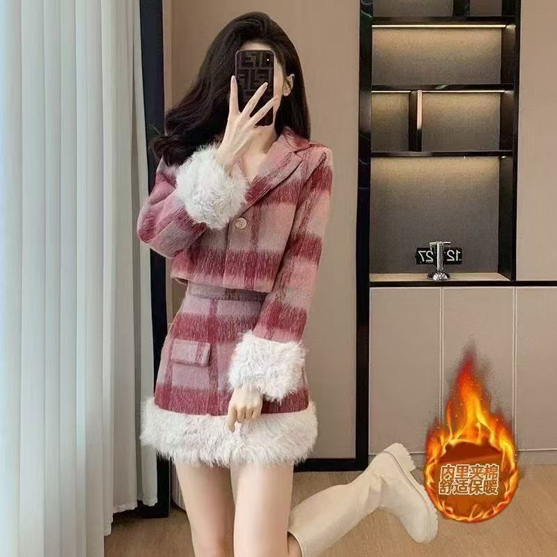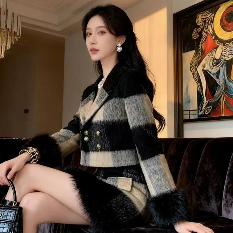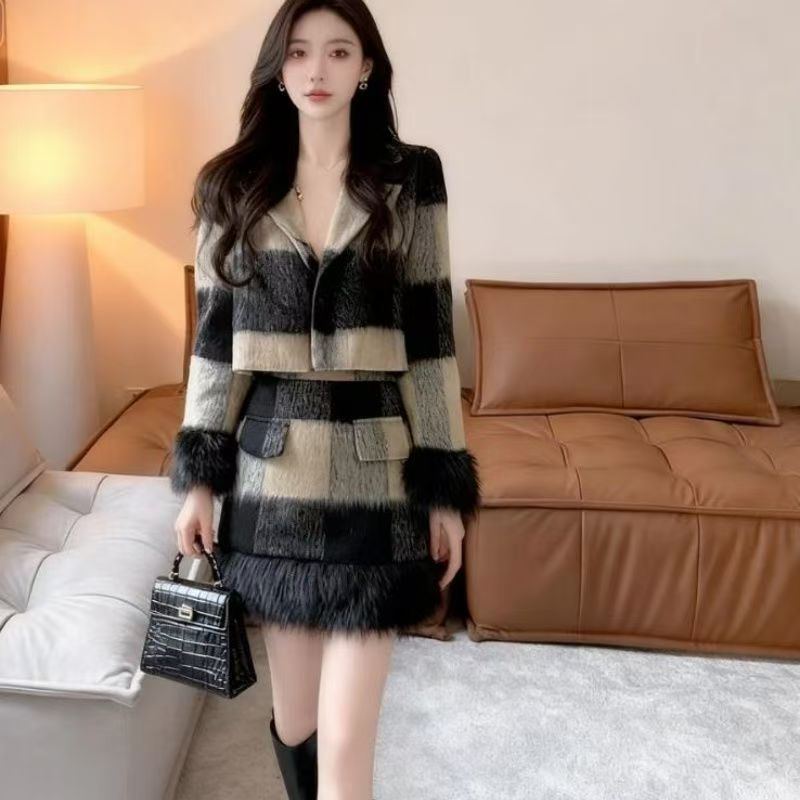 YF6345-(2色入内)冬季名媛风复古格子毛毛袖拼接短款上衣配A字短款小香风套装