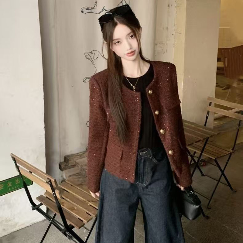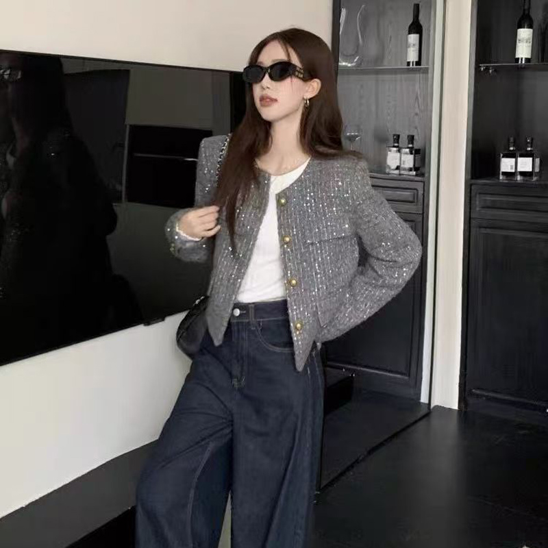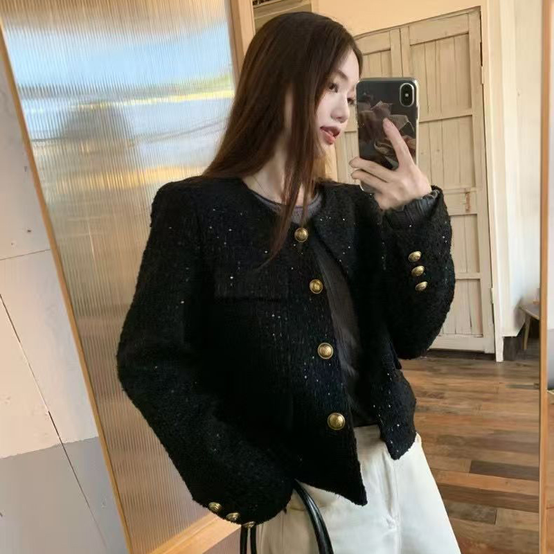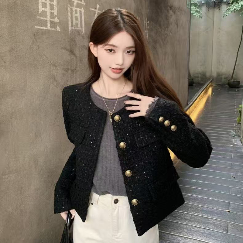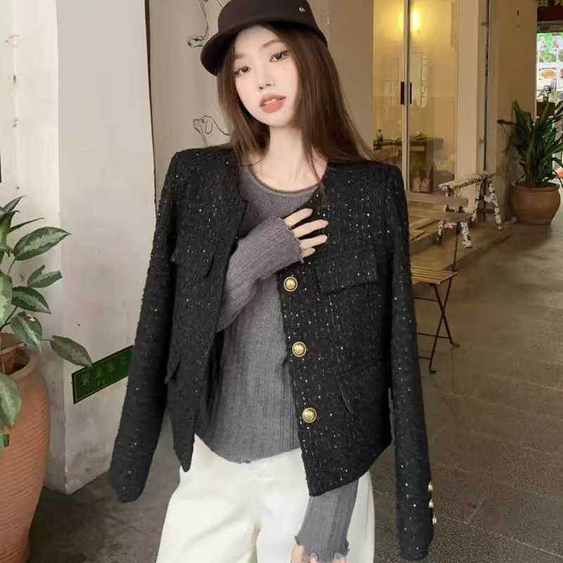 YF6346-(3色入内)小香风秋冬新款闪闪亮设计长袖系扣宽松大码短款毛呢外套