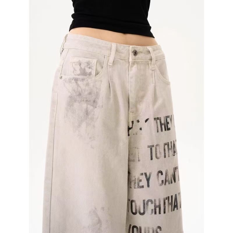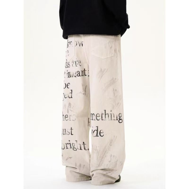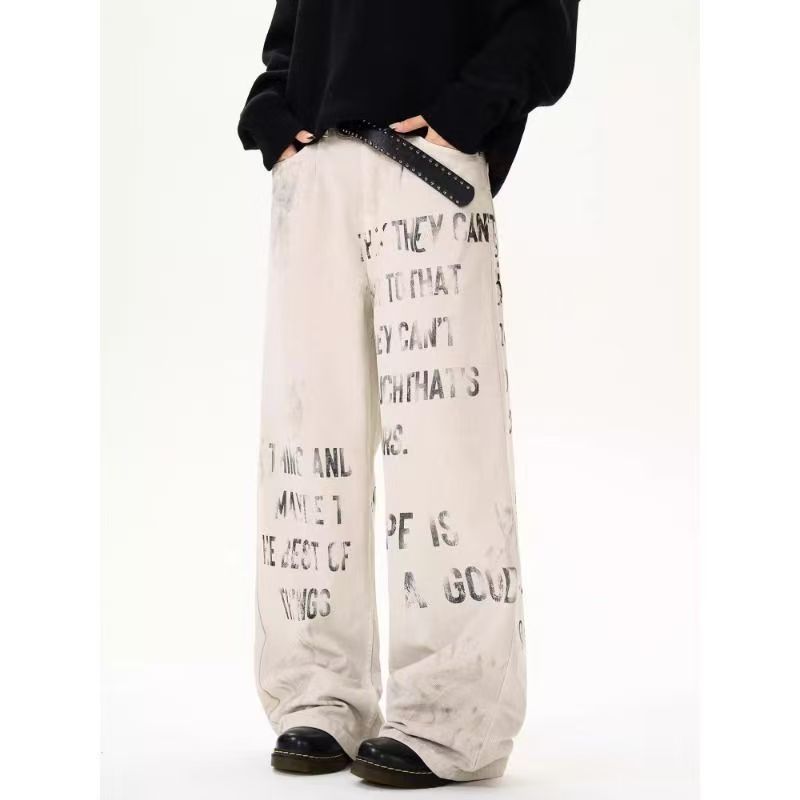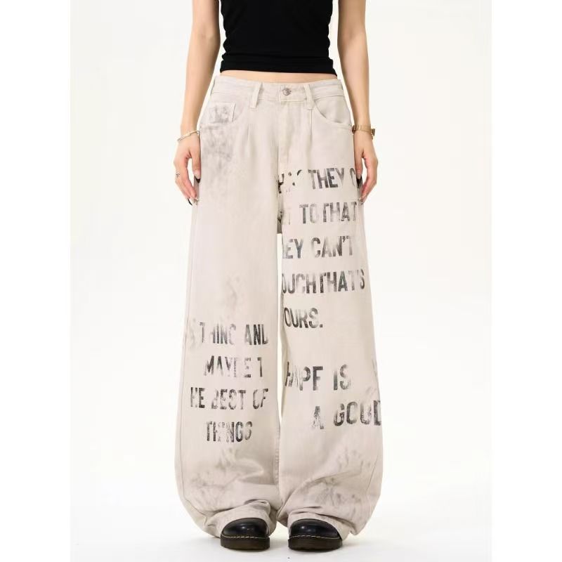 YF6353-图片色非主流个性涂鸦字母印花高腰直筒坠地感港式大码牛仔裤