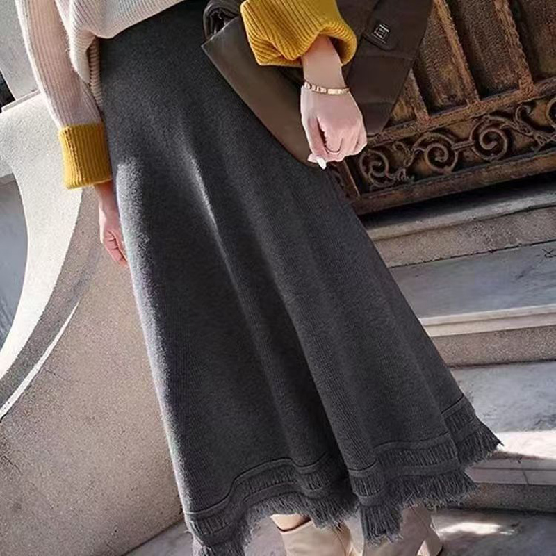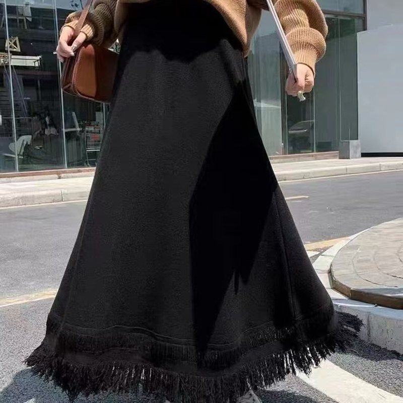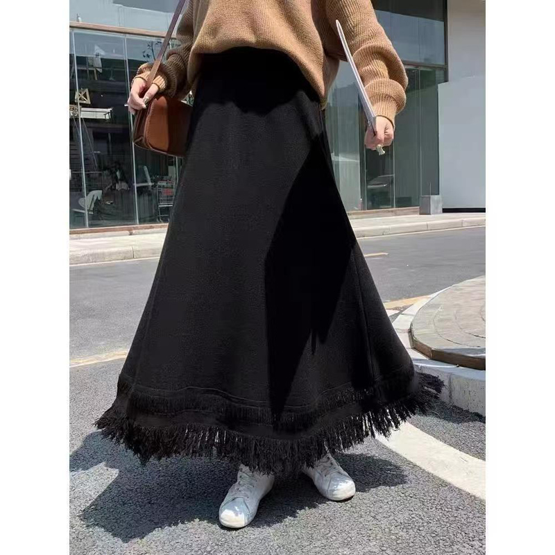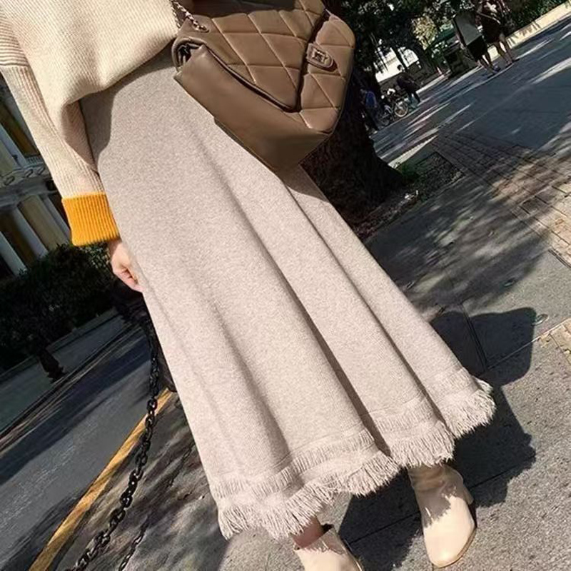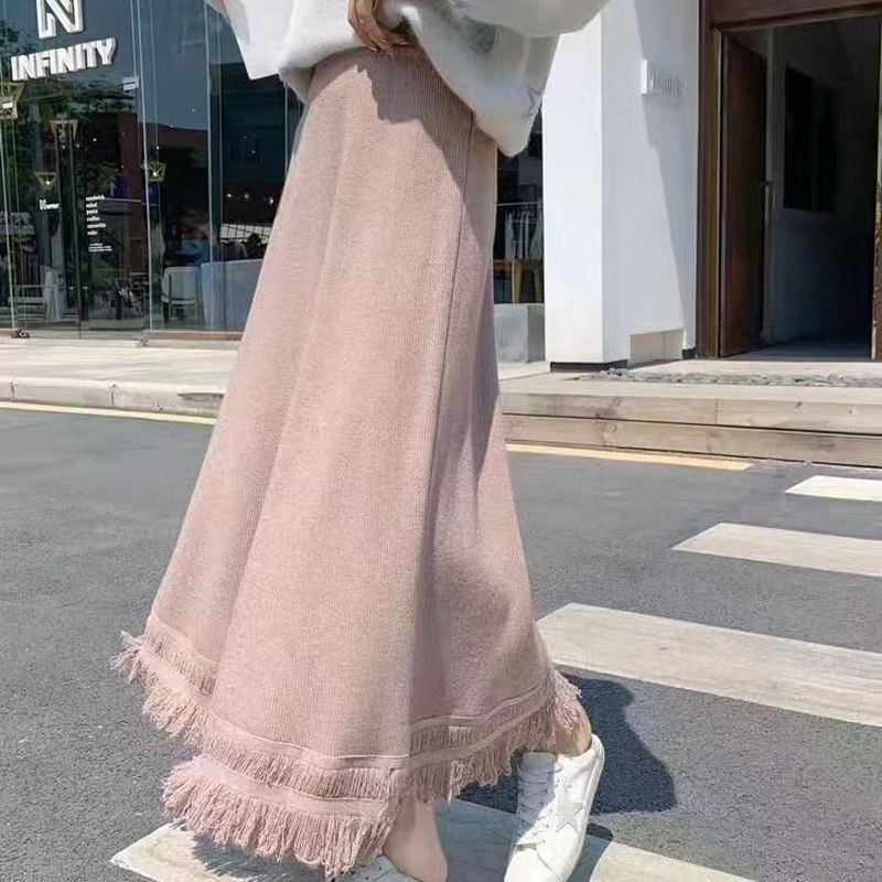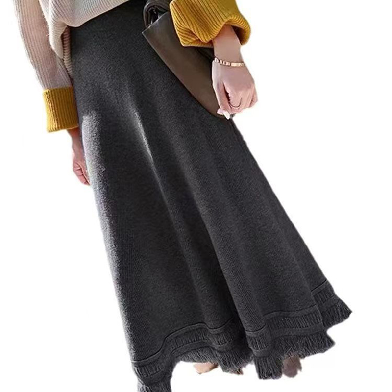 YF6358-(3色入内)冬季加厚收腹高腰A字大摆流苏中长款针织保暖ins长裙