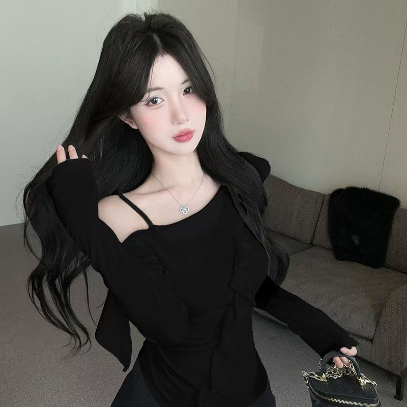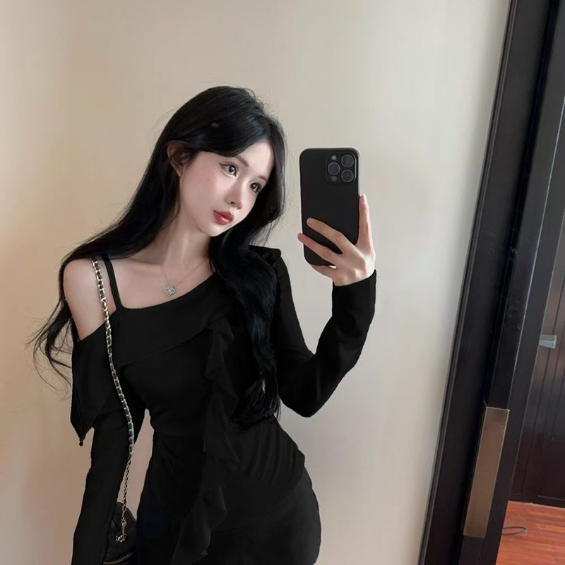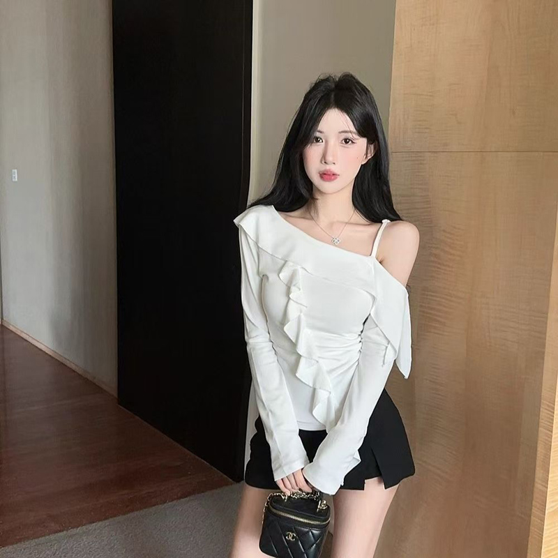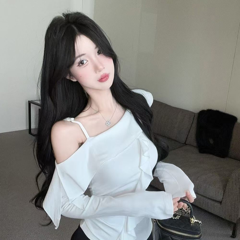 YF6361-(2色入内)性感时尚露单肩一字肩不规则荷叶边开叉吊带春秋纯欲风打底衫