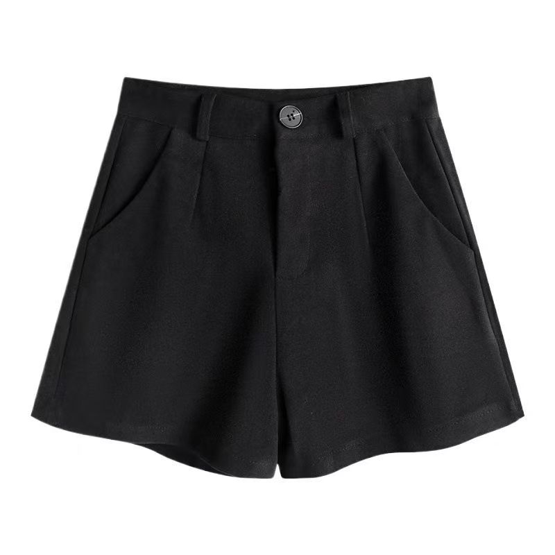 YF6363-(2色入内)2025新款加厚毛呢系扣高腰A字阔腿显瘦纯色百搭冬热款短裤