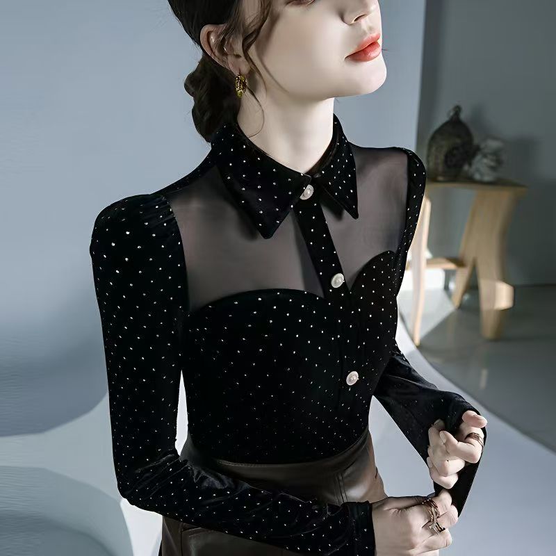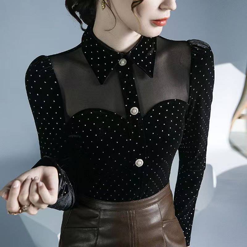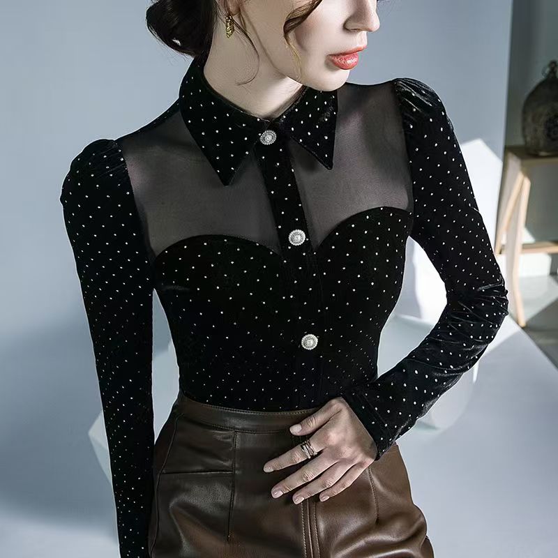 YF6364-图片色甜美时尚精品波点网纱拼接透视设计长袖POLO领衬衫
