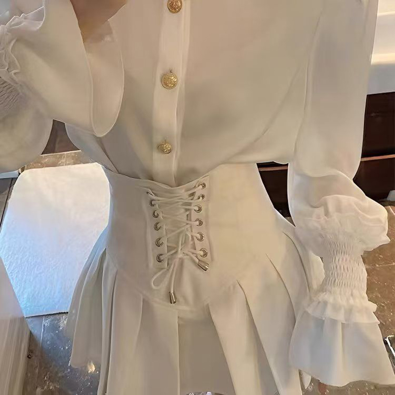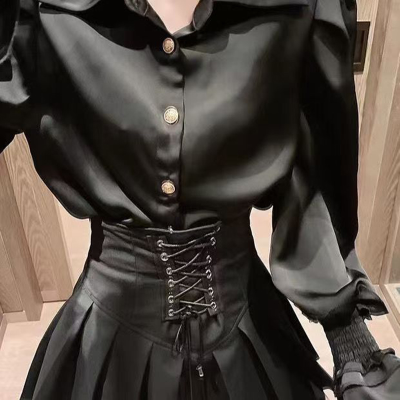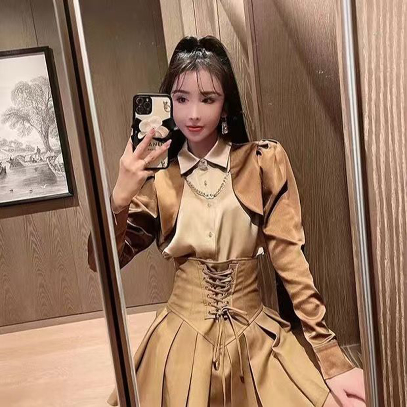 YF6375-(6色入内)法式洋气新款长袖后背绑绳束腰堆领绸缎感大码精致上衣
