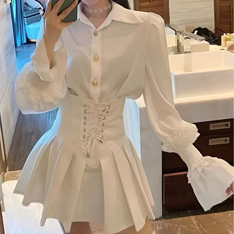 YF6373-(3色入内)韩版精致设计收腹高腰交叉穿绳拼接百褶纯色小可爱短裙