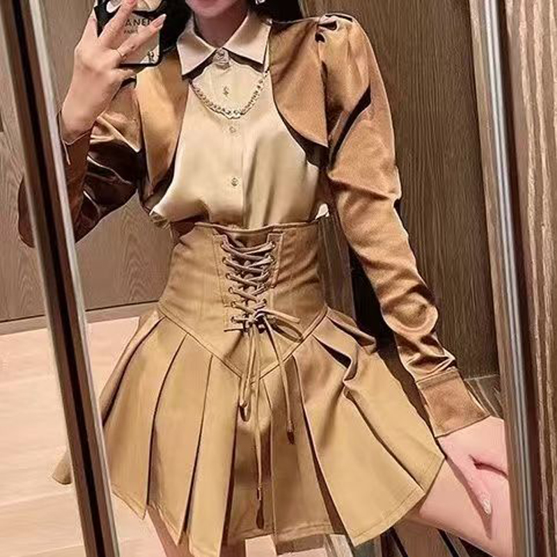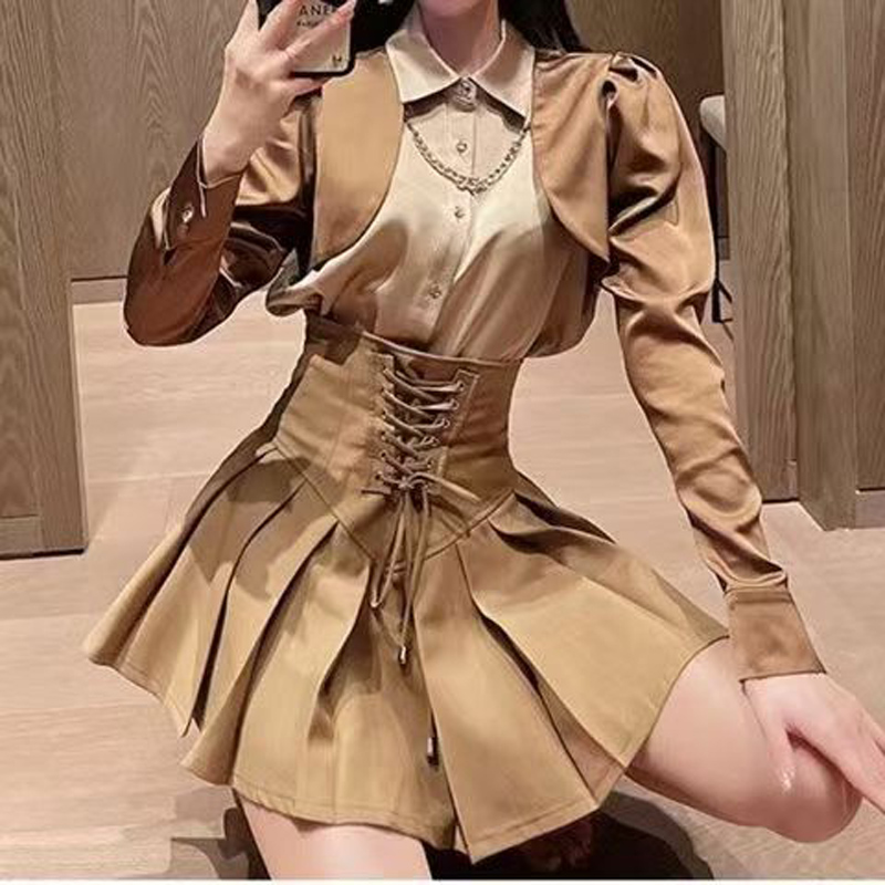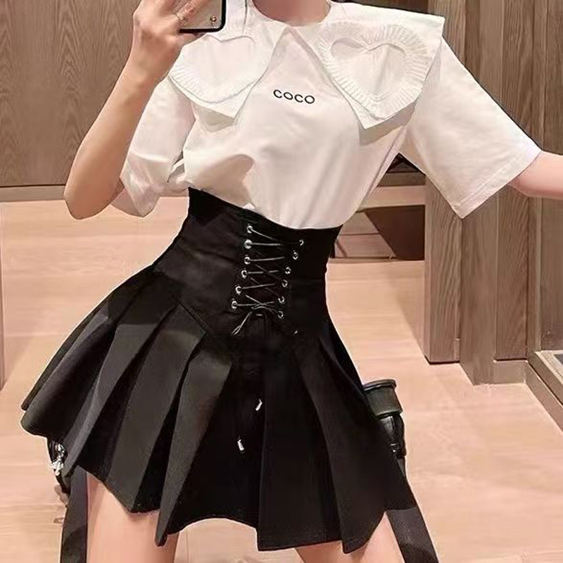 YF6373-(3色入内)韩版精致设计收腹高腰交叉穿绳拼接百褶纯色小可爱短