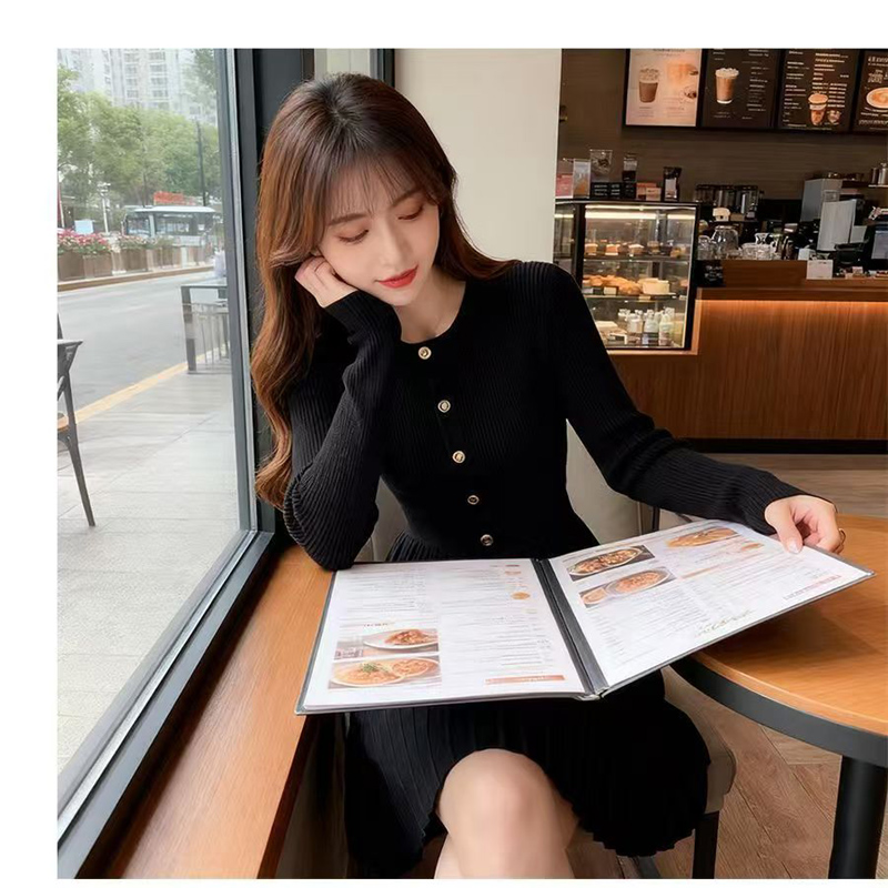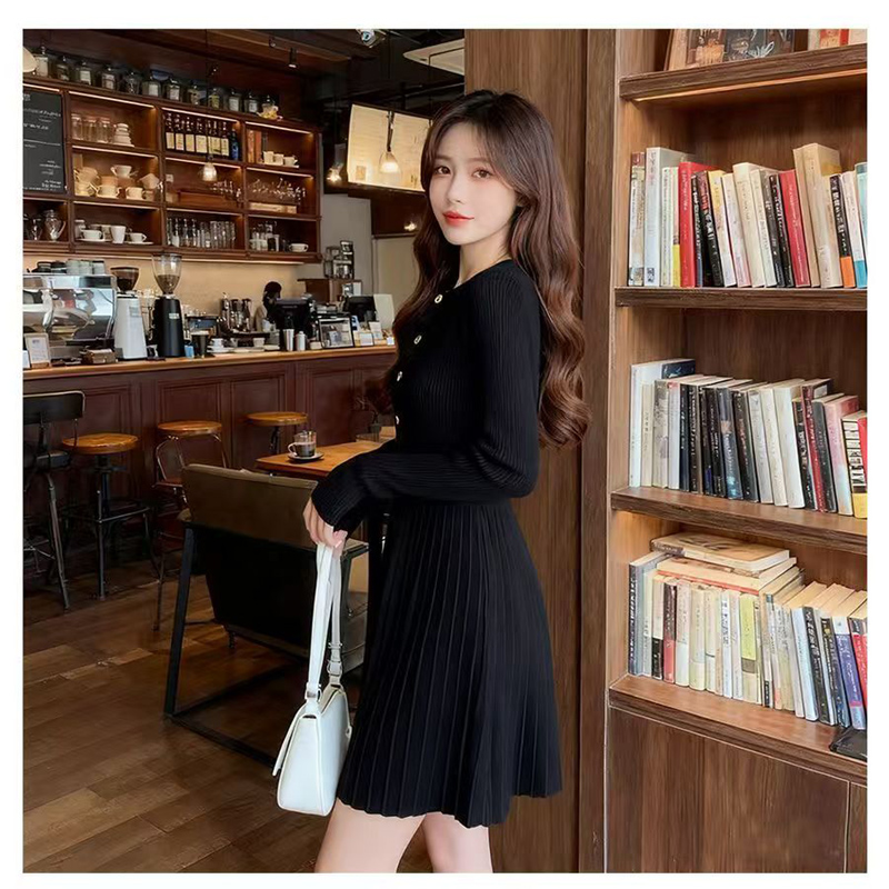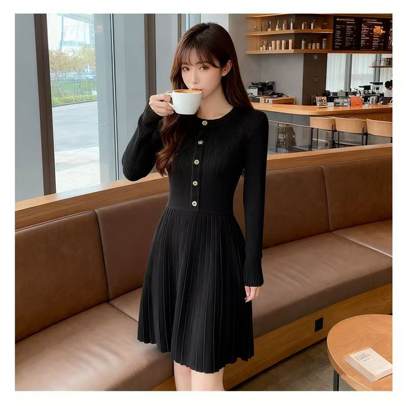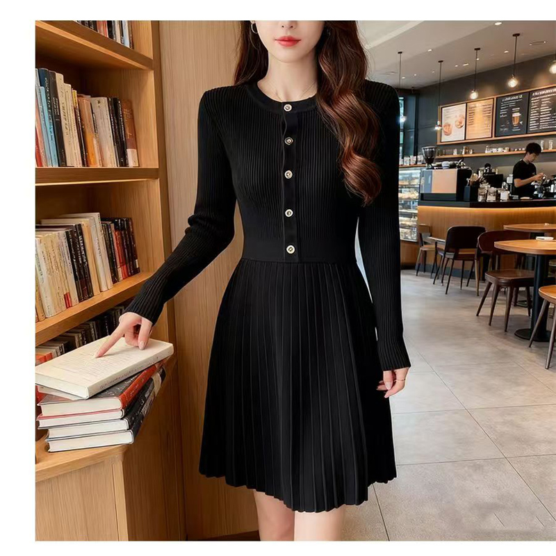 YF6376-图片色好品质冬季新款排扣圆领坑纹百褶弹力修身针织连衣裙