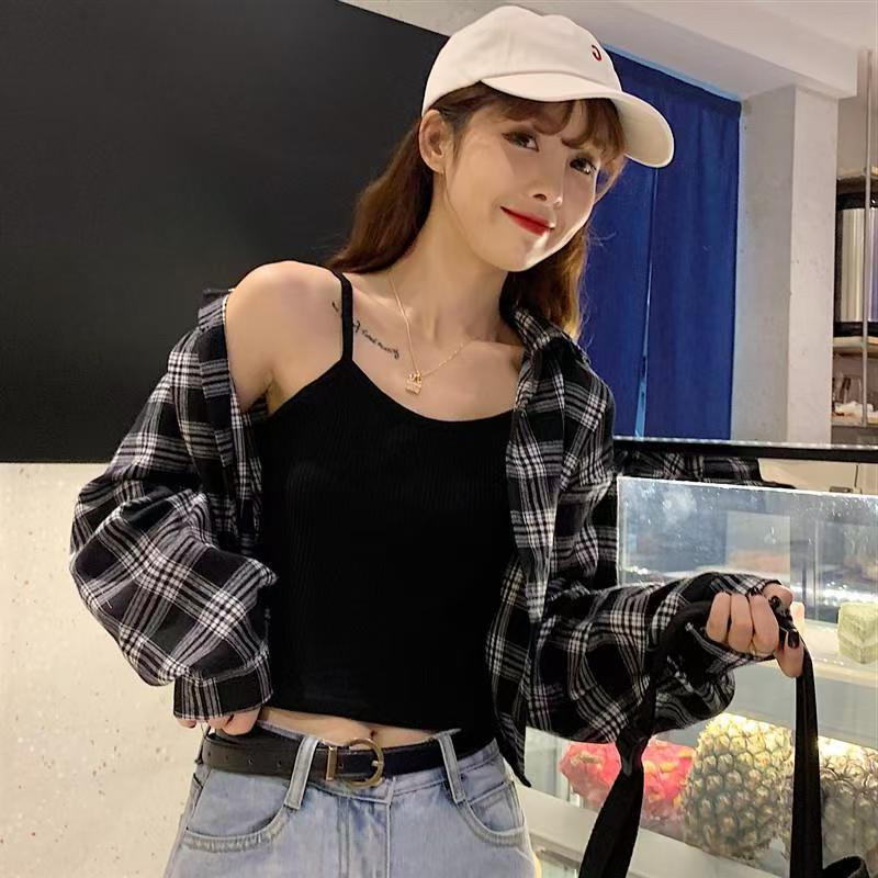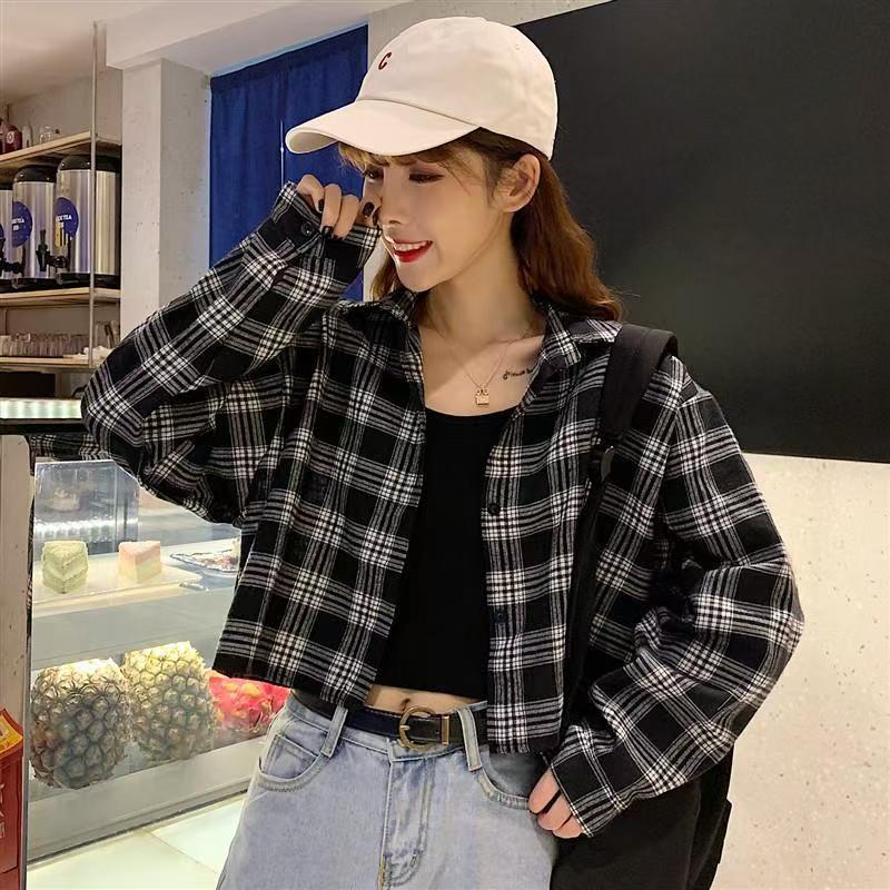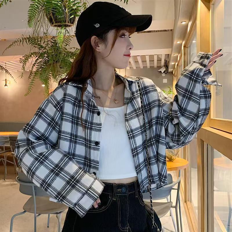 YF6381-(2色入内)时尚小外套短款长袖POLO领复古格子宽松大码百搭上衣