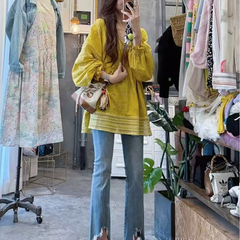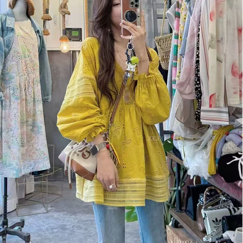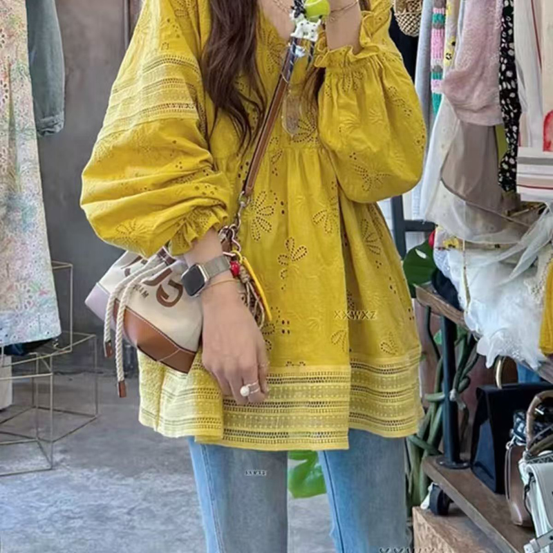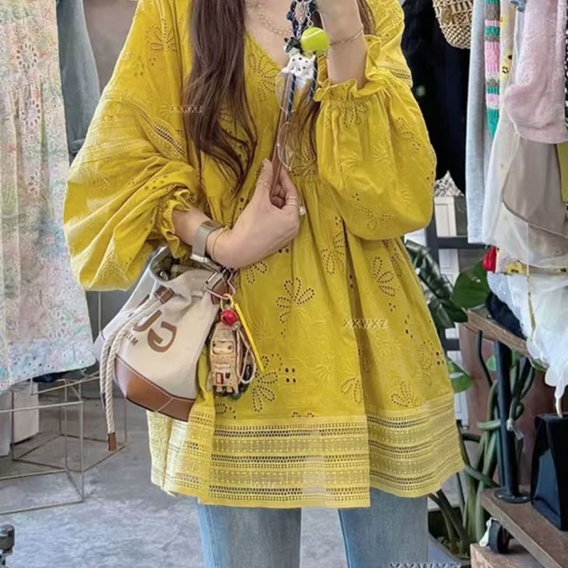 YF6390-图片色2025新款灯笼袖圆领镂空碎花刺绣A字大码显瘦蕾丝上衣