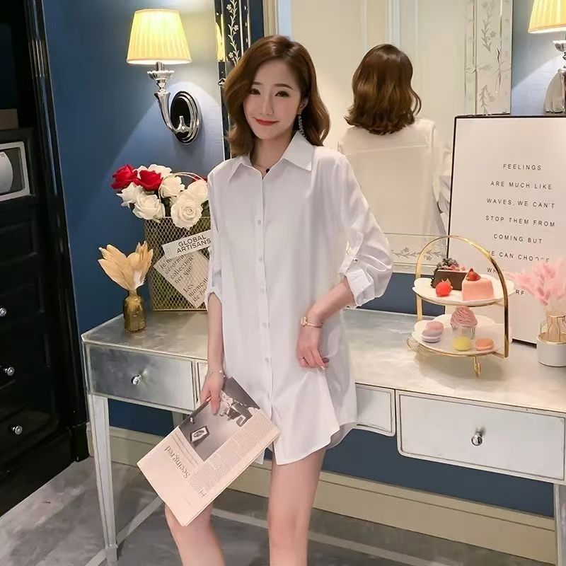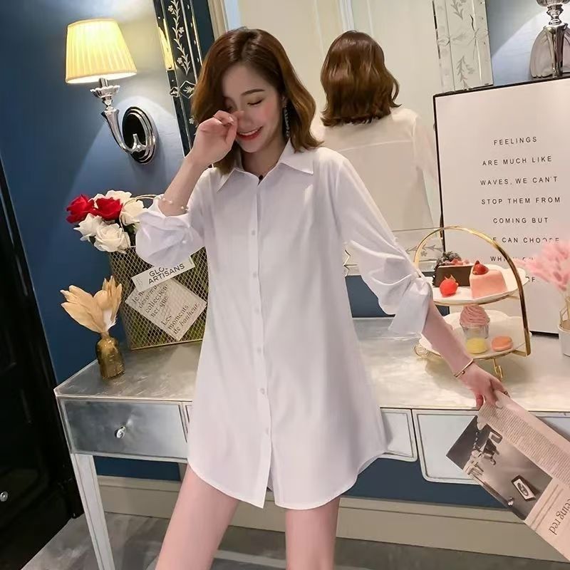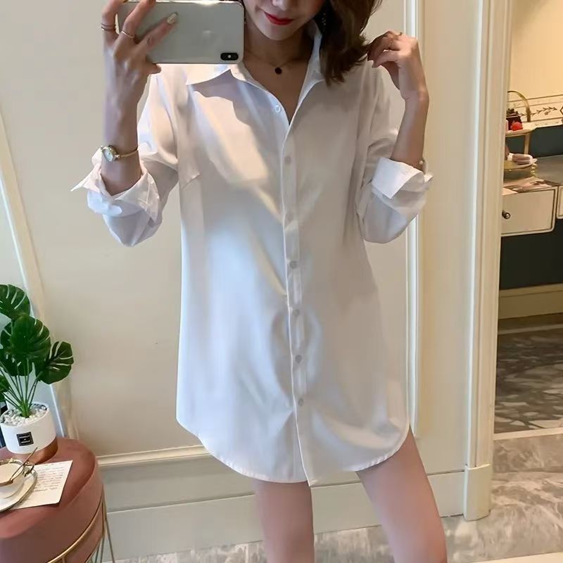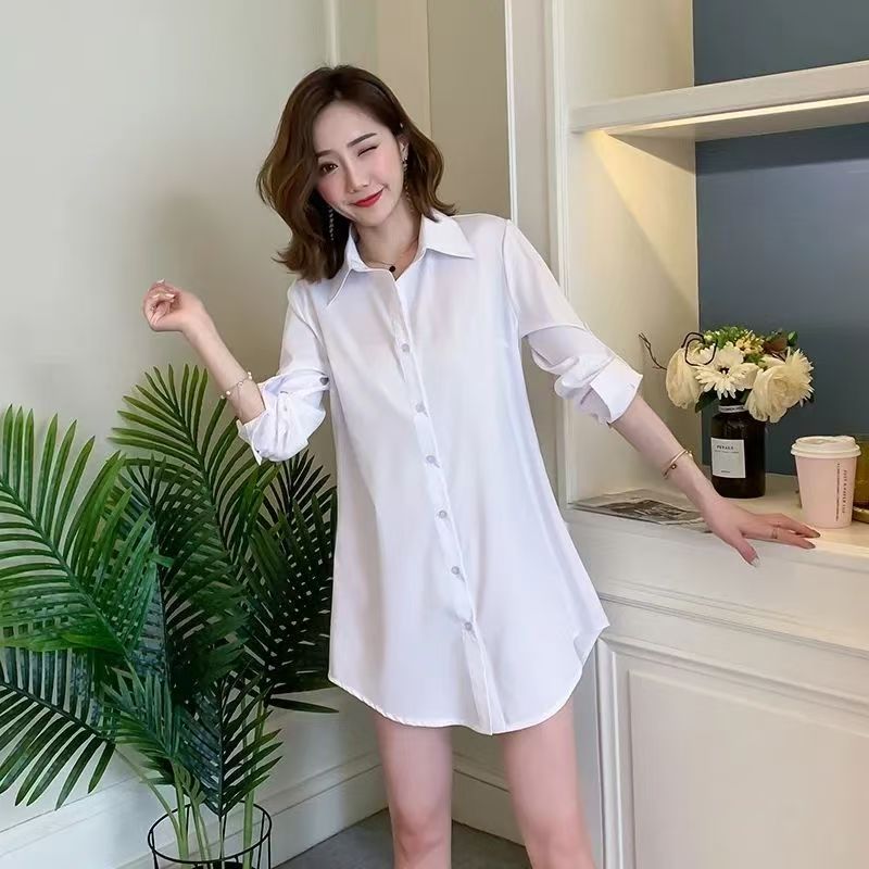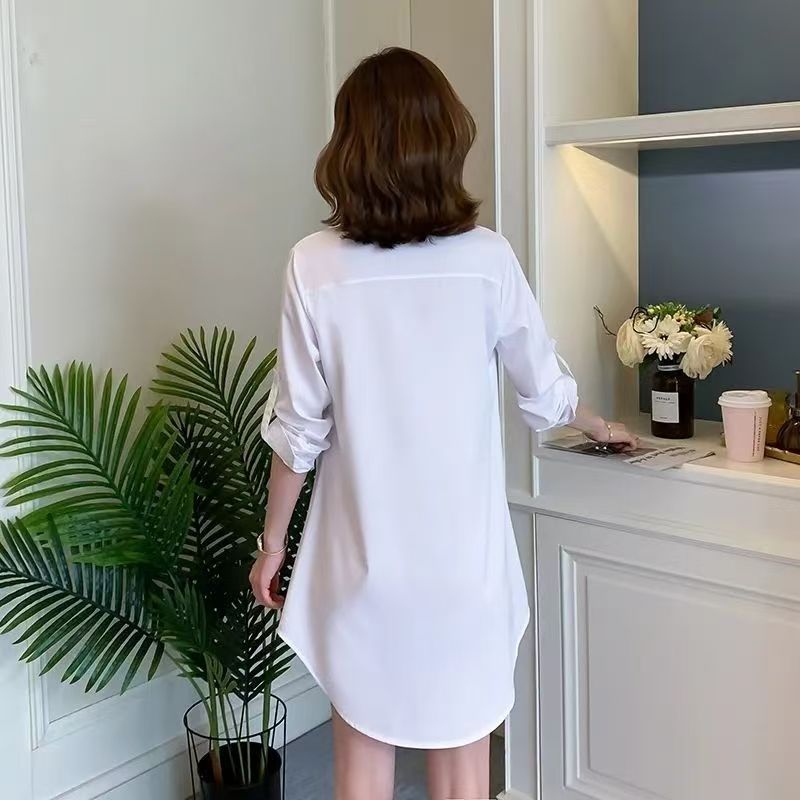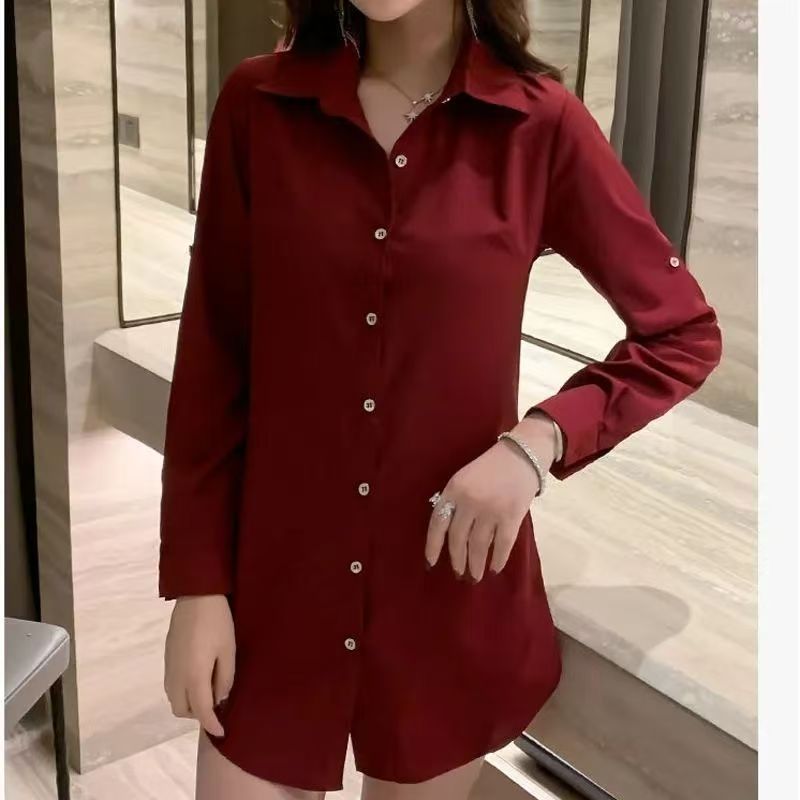 YF6393-(4色入内)甜美时尚中长款弧边修腰显瘦可调长袖翻领系扣纯色雪纺衬衣