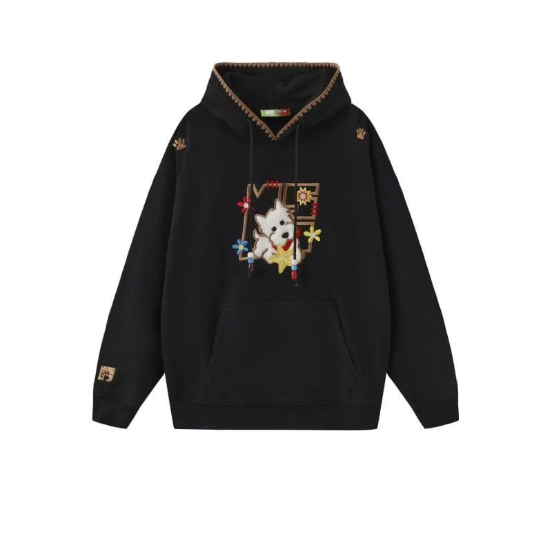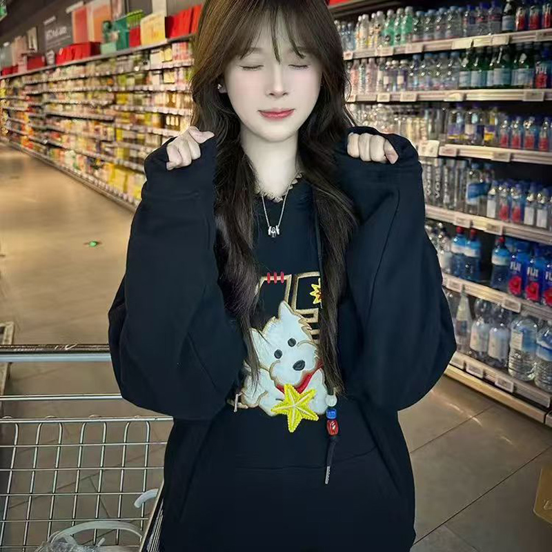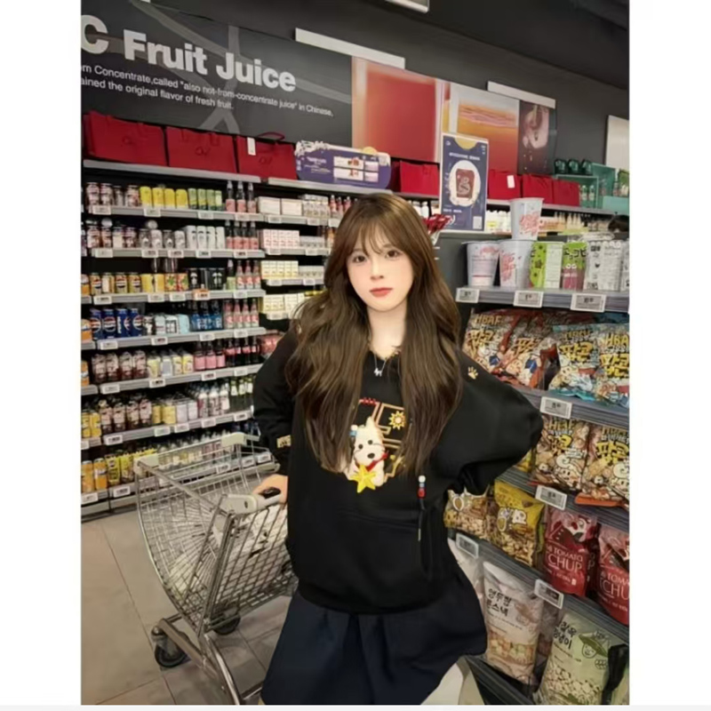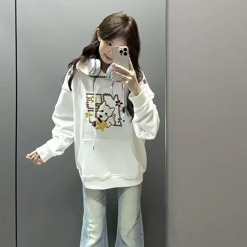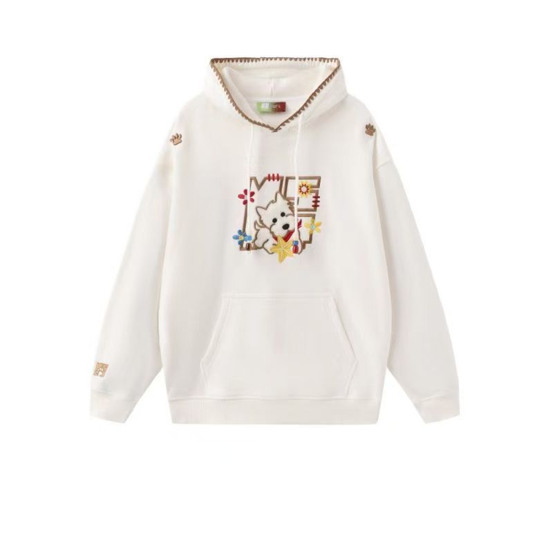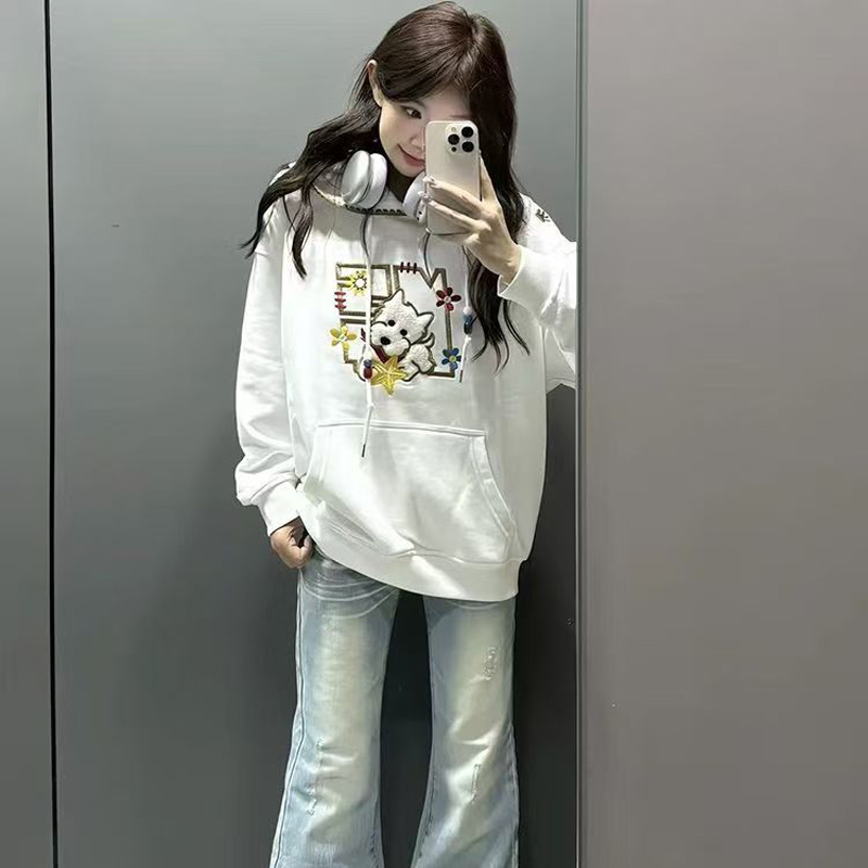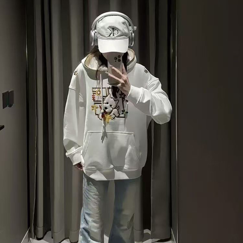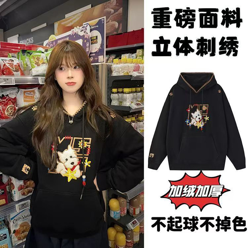 YF6430-(2色入内)港式冬季可爱卡通刺绣设计长袖连帽宽松大码加绒卫衣上衣