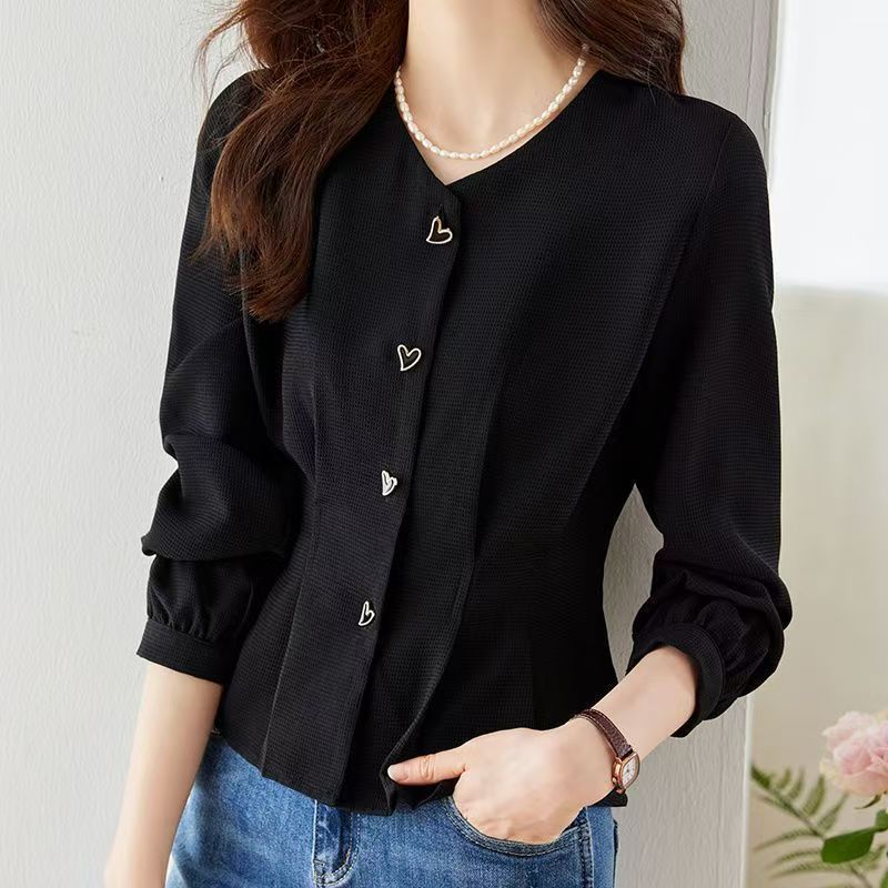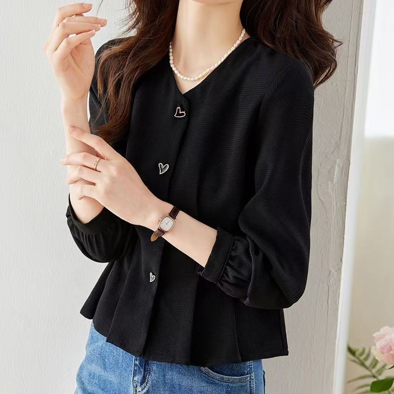 YF6434-图片色韩版秋冬百搭长袖V领爱心纽扣小心机设计感弧边修身上衣