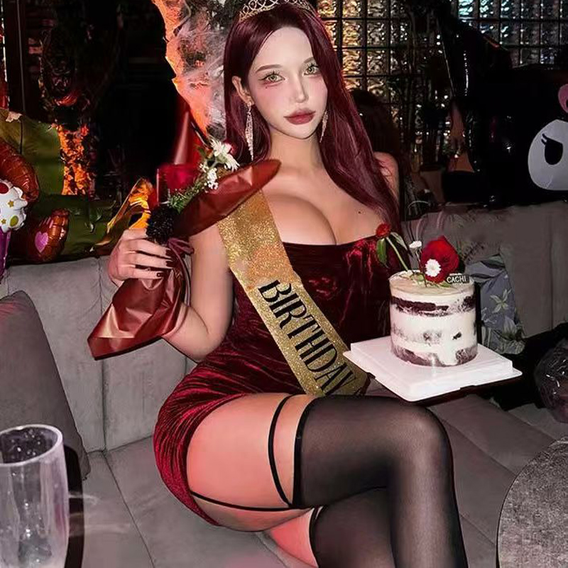 YF6442-(3色入内)新款圣诞红性感抹胸系蝴蝶结设计修腰包臀褶折丝绒礼服