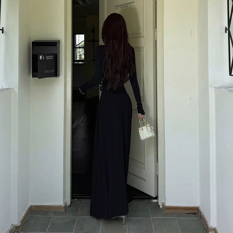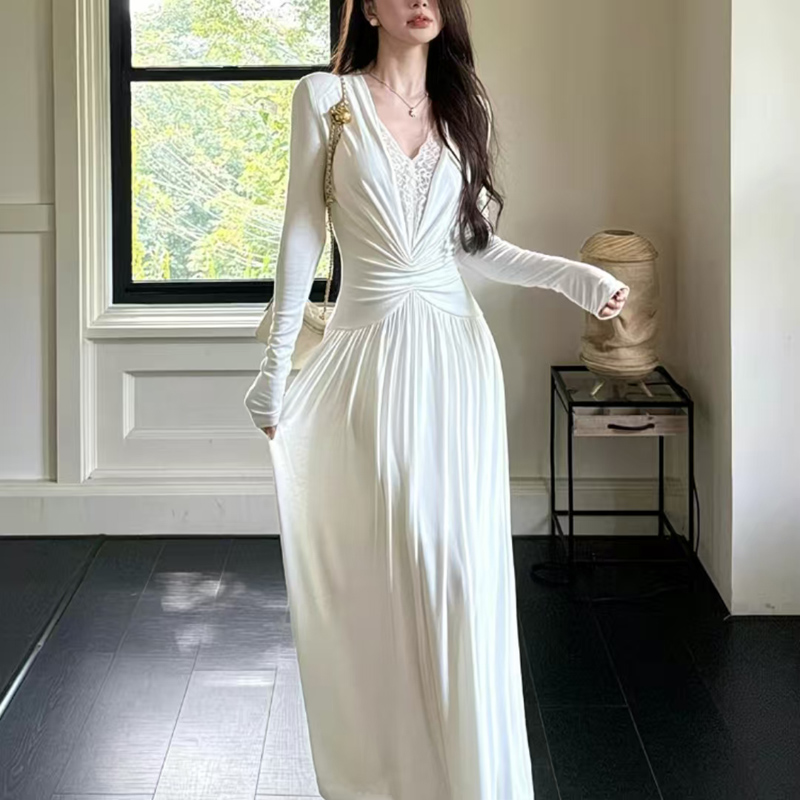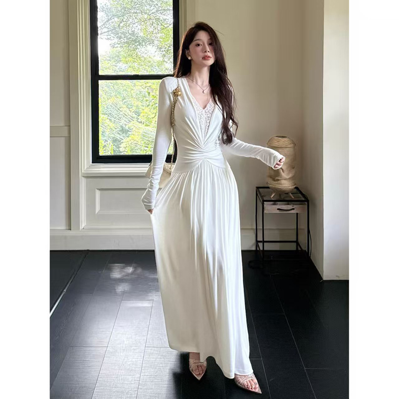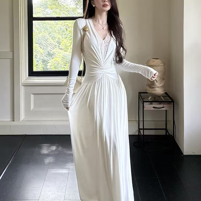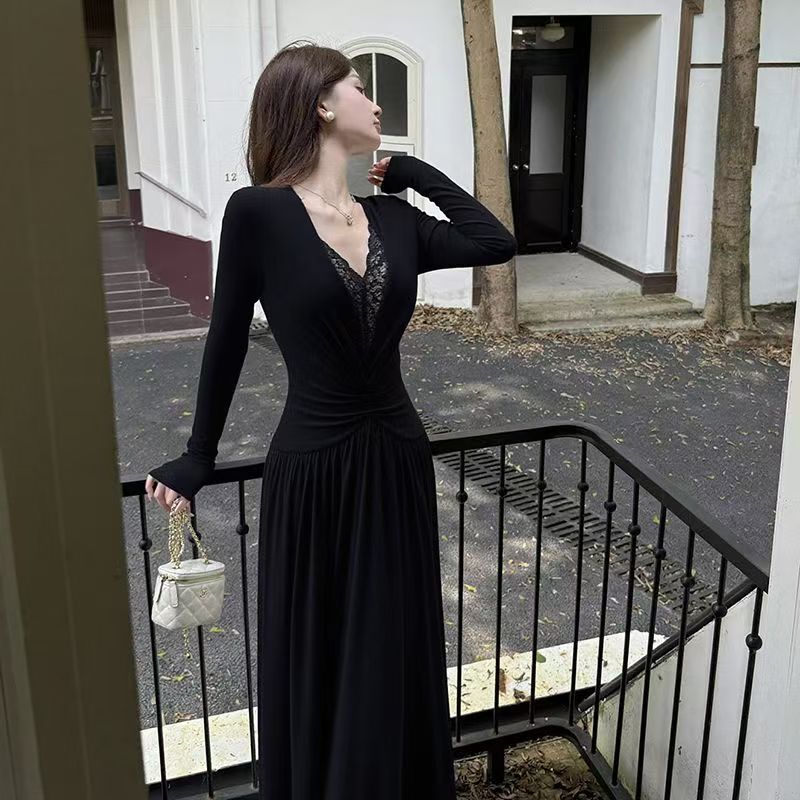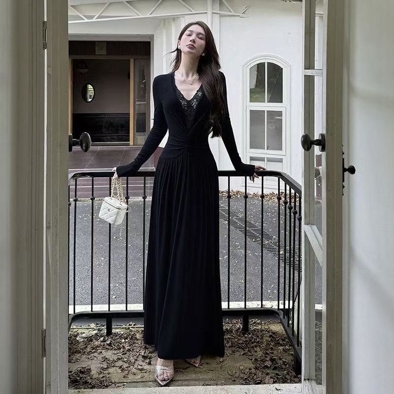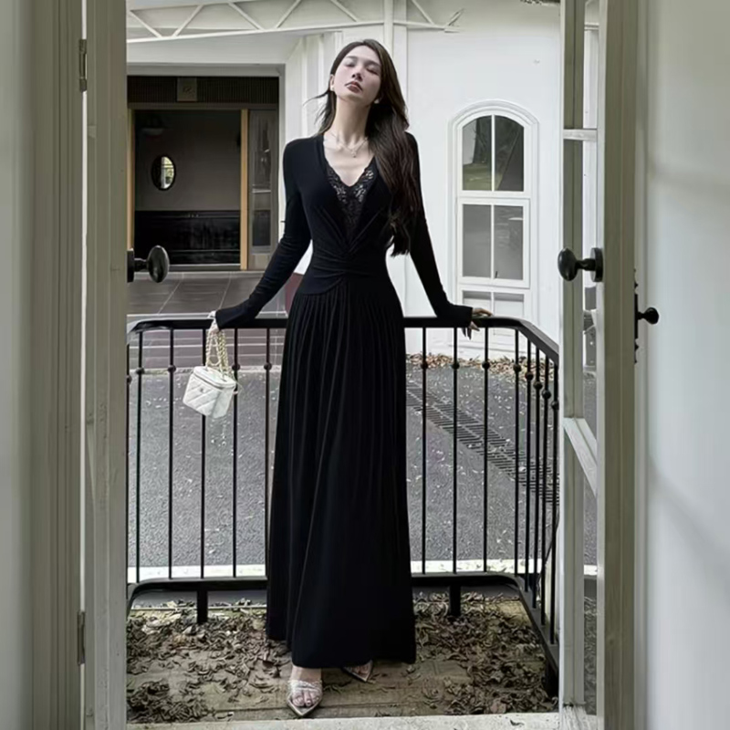 YF6447-(2色入内)名媛风蕾丝拼接镂空拼接弹力修身中长款复古风法式连衣裙