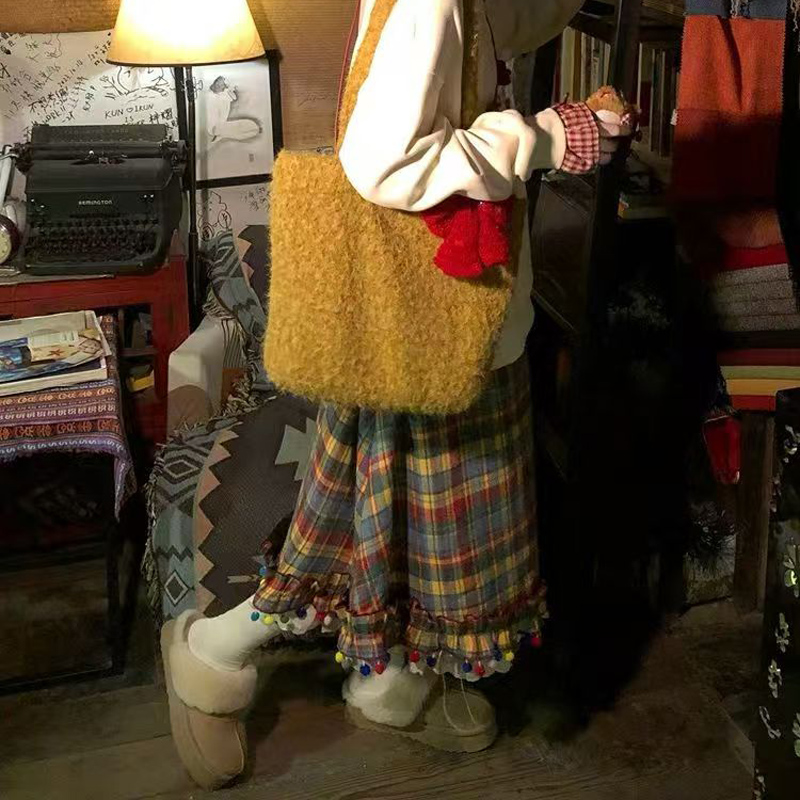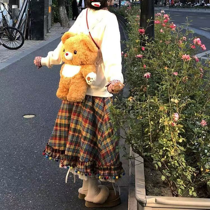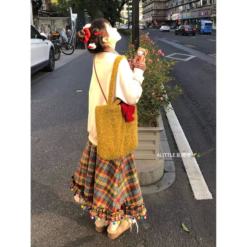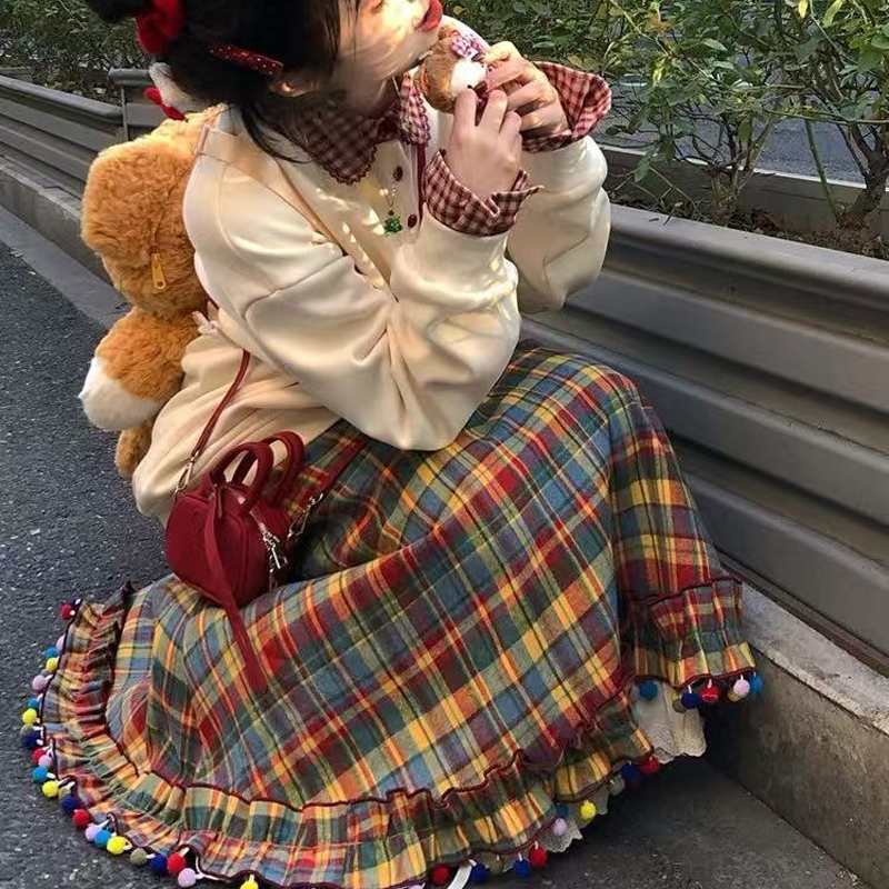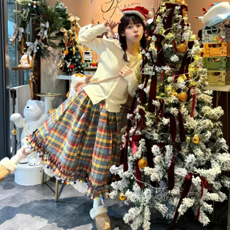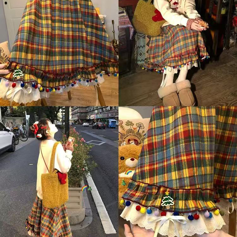 YF6448-图片色时尚韩版复古风彩格子A字大摆中长款圣诞节日褶折半身裙