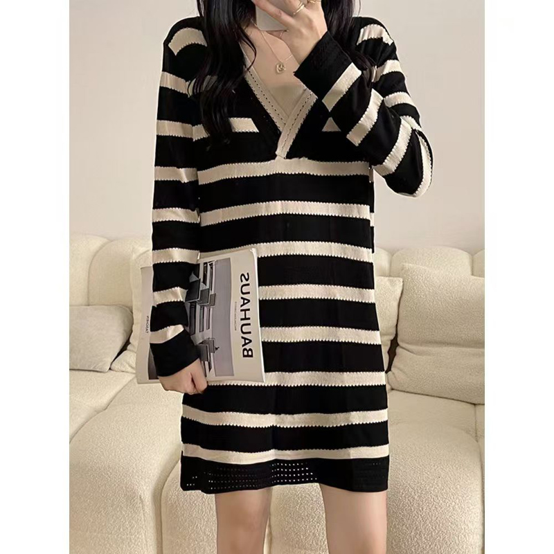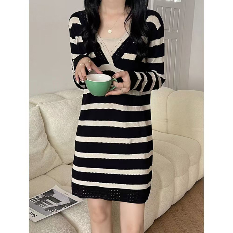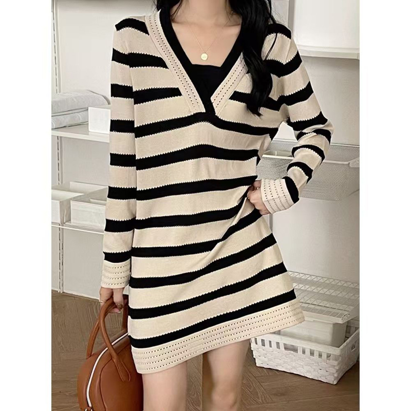 YF6454-(2色入内)港式冬季洋气撞色条纹V领长袖宽松藏肉显瘦针织连衣裙