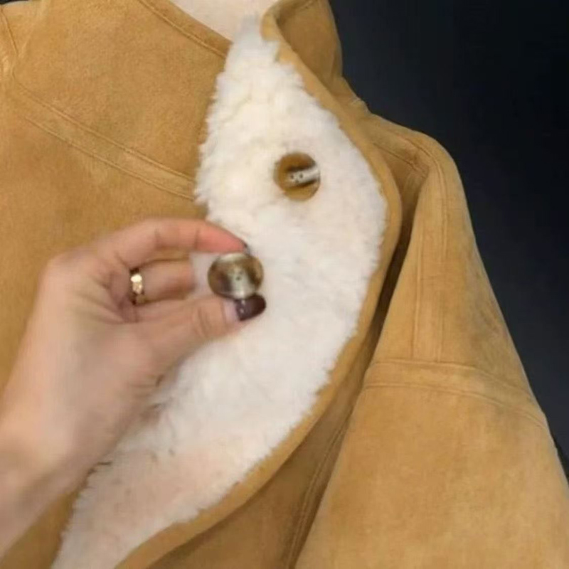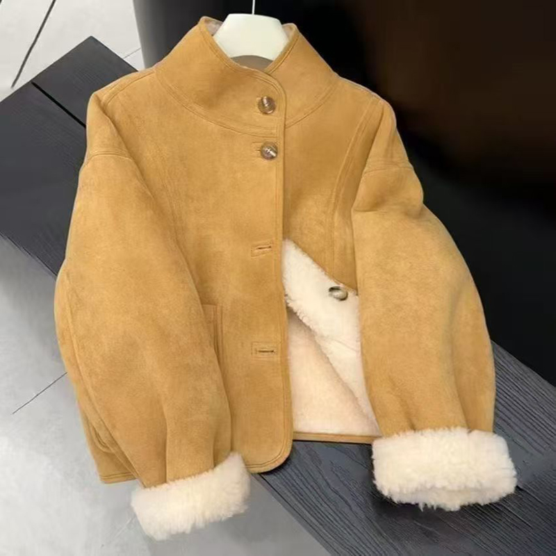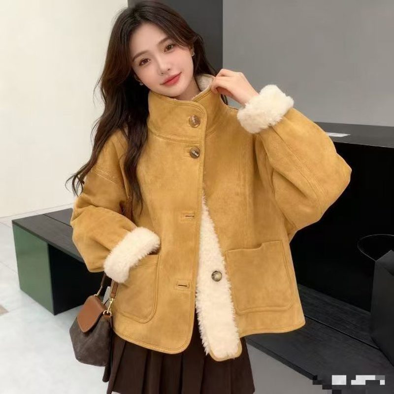 YF6457-图片色港式立领仿皮加绒羊羔绒冬季高级感长袖短装夹克上衣
