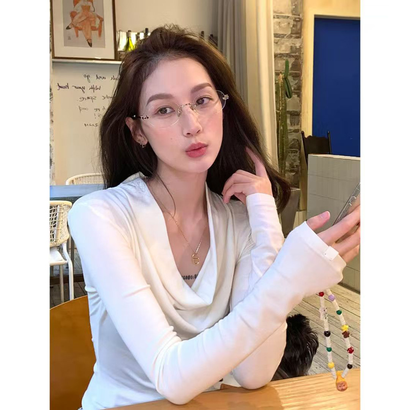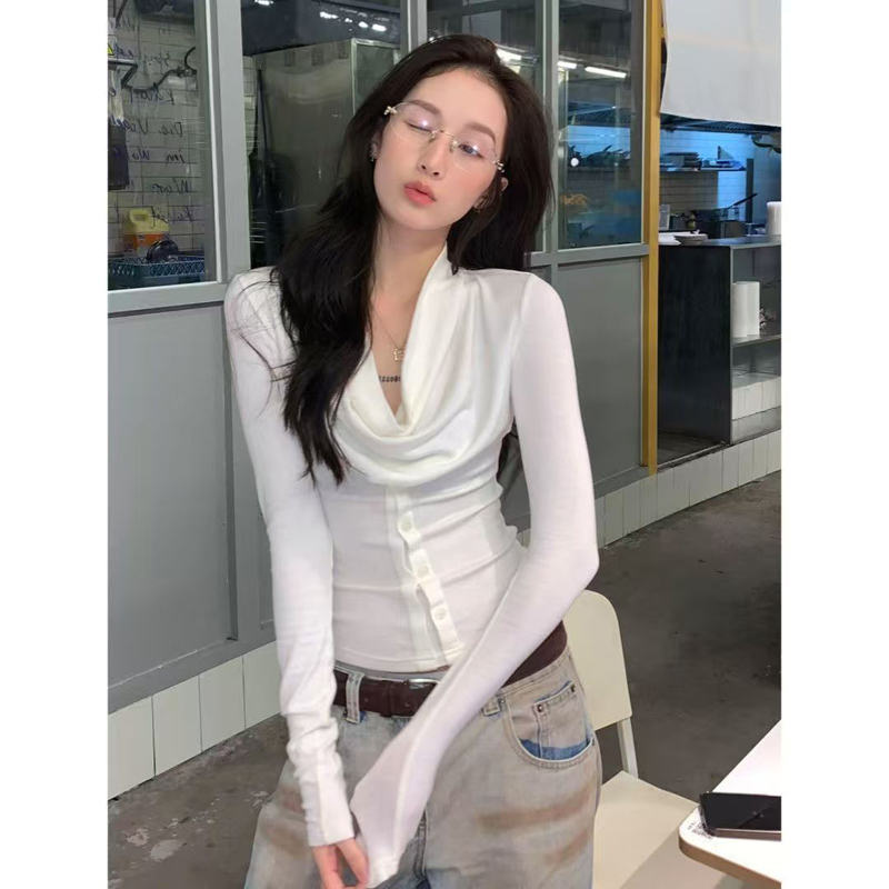 YF6458-图片色韩版小心机设计堆堆领套头排扣弹力收腹显瘦白色时尚上衣